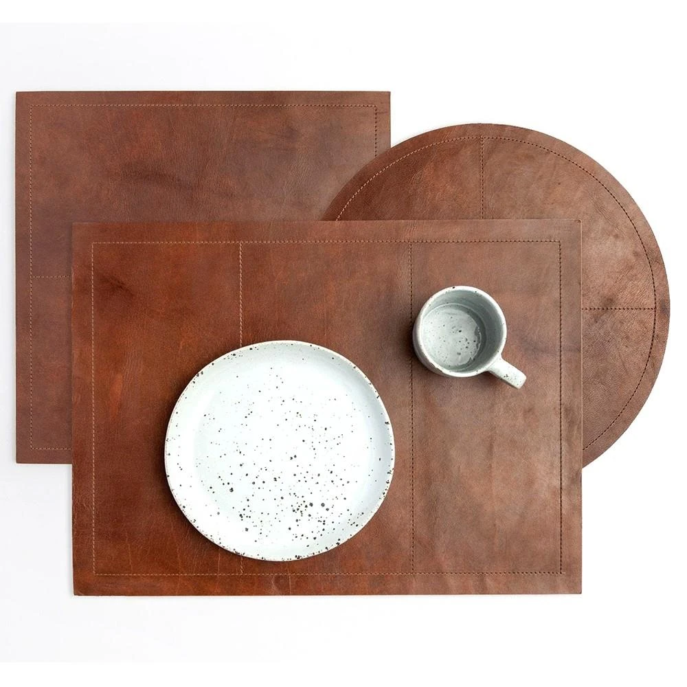 • Evan Rustic Lodge Brown Leather Round Placemat - Set of 2|Kathy Kuo Home