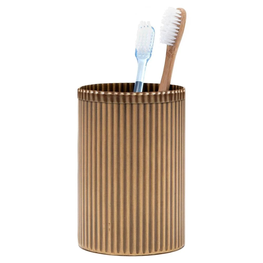 Add style and intrigue to your bathroom design with our Pigeon and Poodle Redon Modern Antique Brass Ribbed Metal Brush Holder. This gl ... more