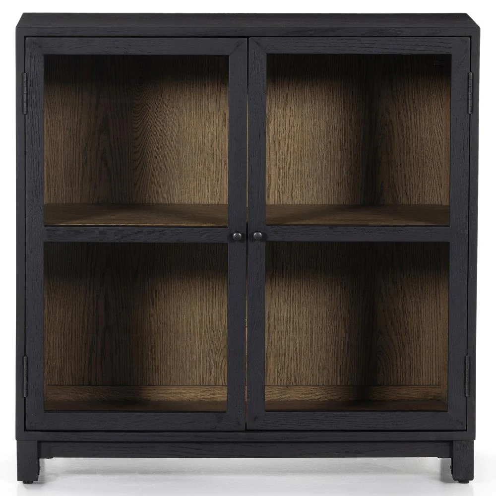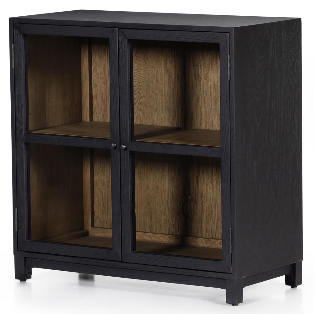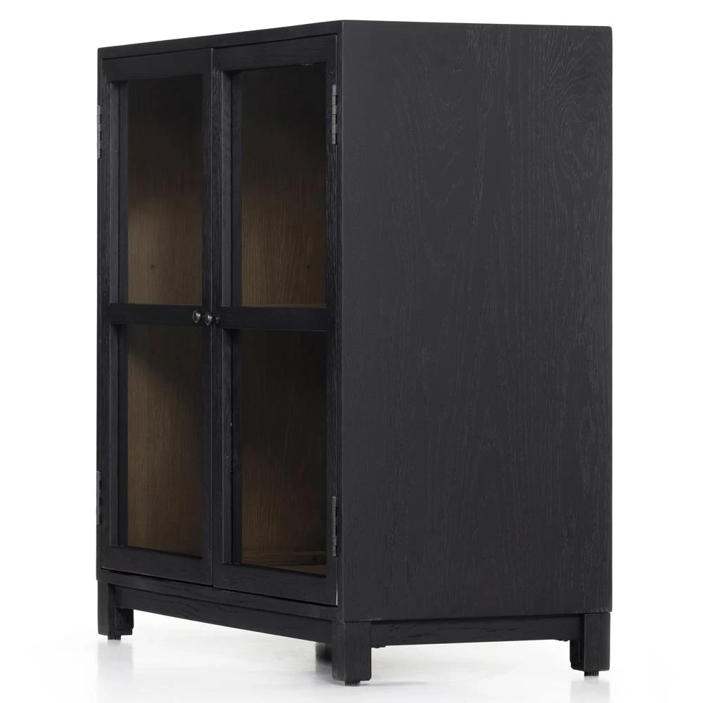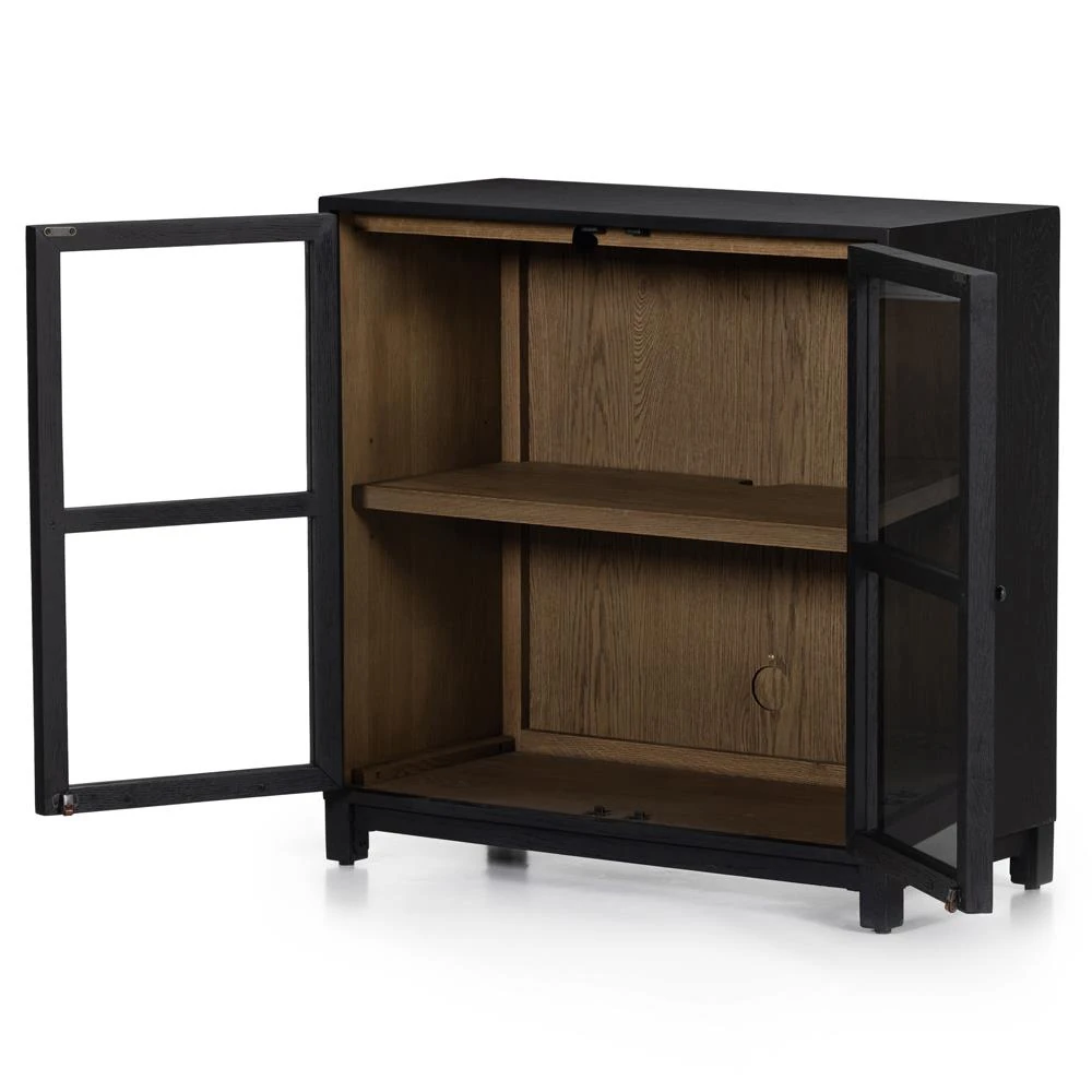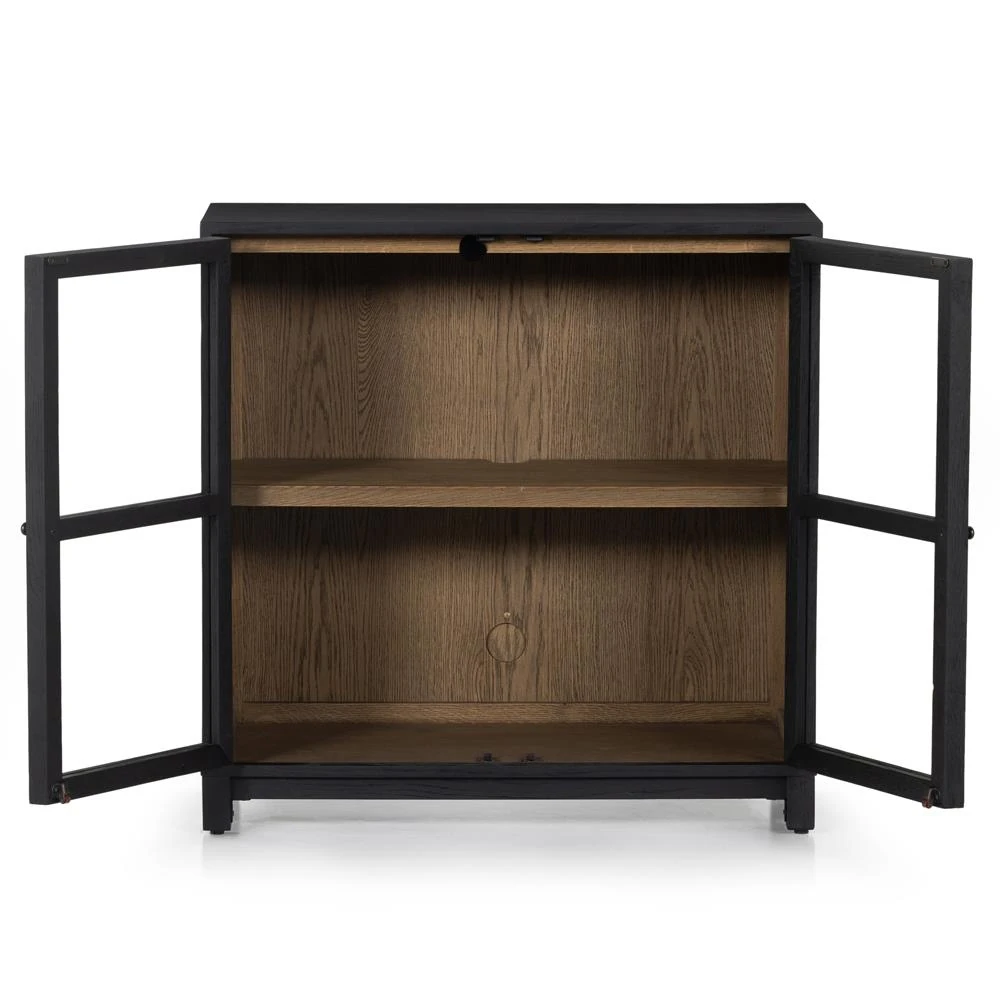• Features a black drifted oak frames lighter interior shelving for subtle but striking contrast