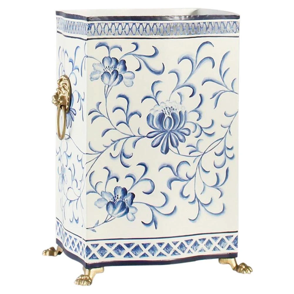 Renee French Country White Tole Hand Painted Blue Wastebasket