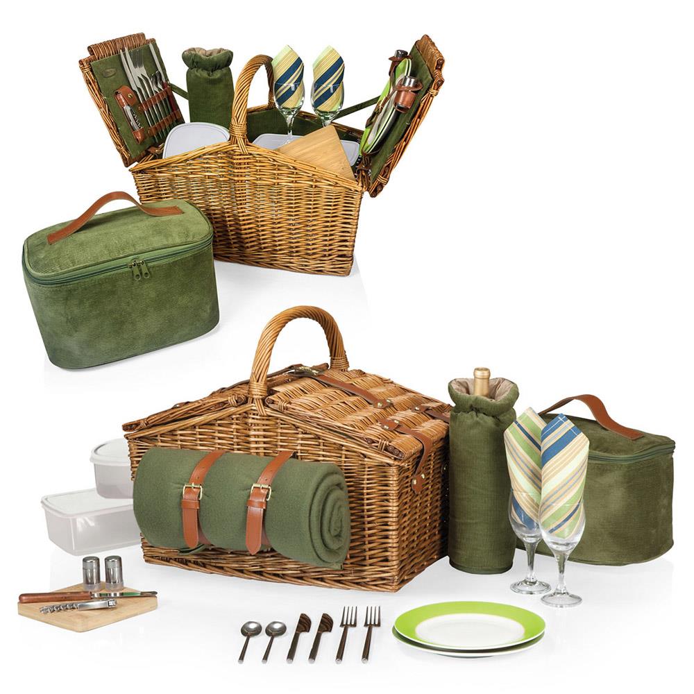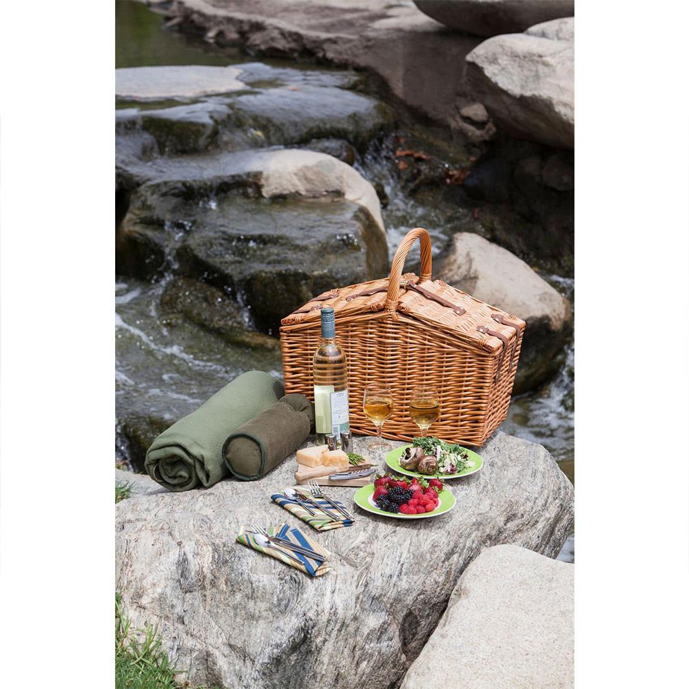Surset French Brown Willow Green Picnic Basket with Serverware for 2