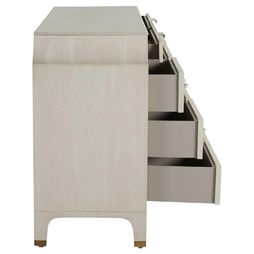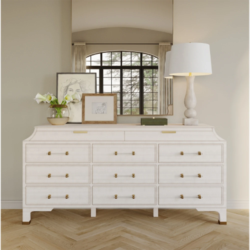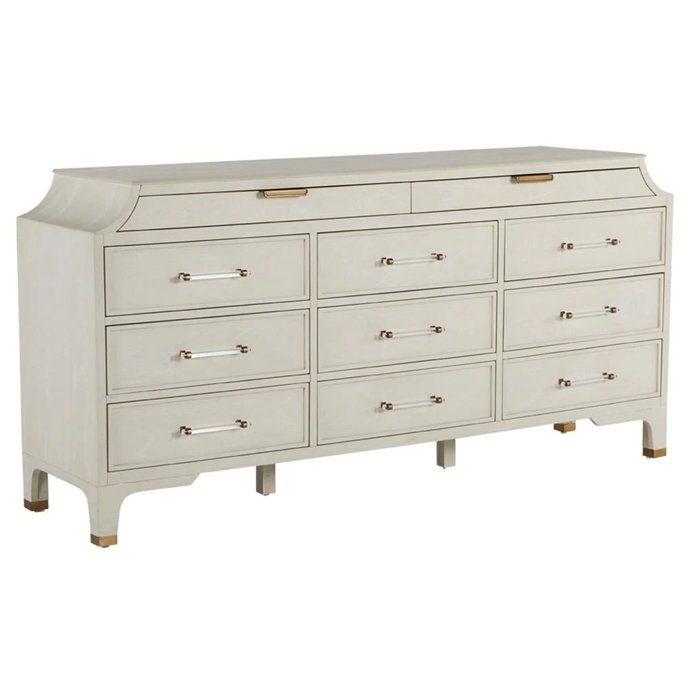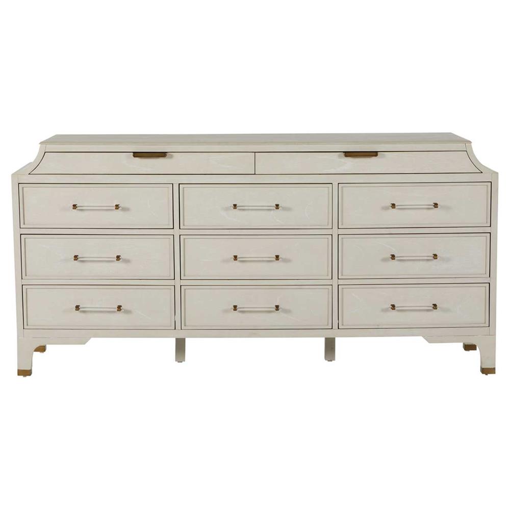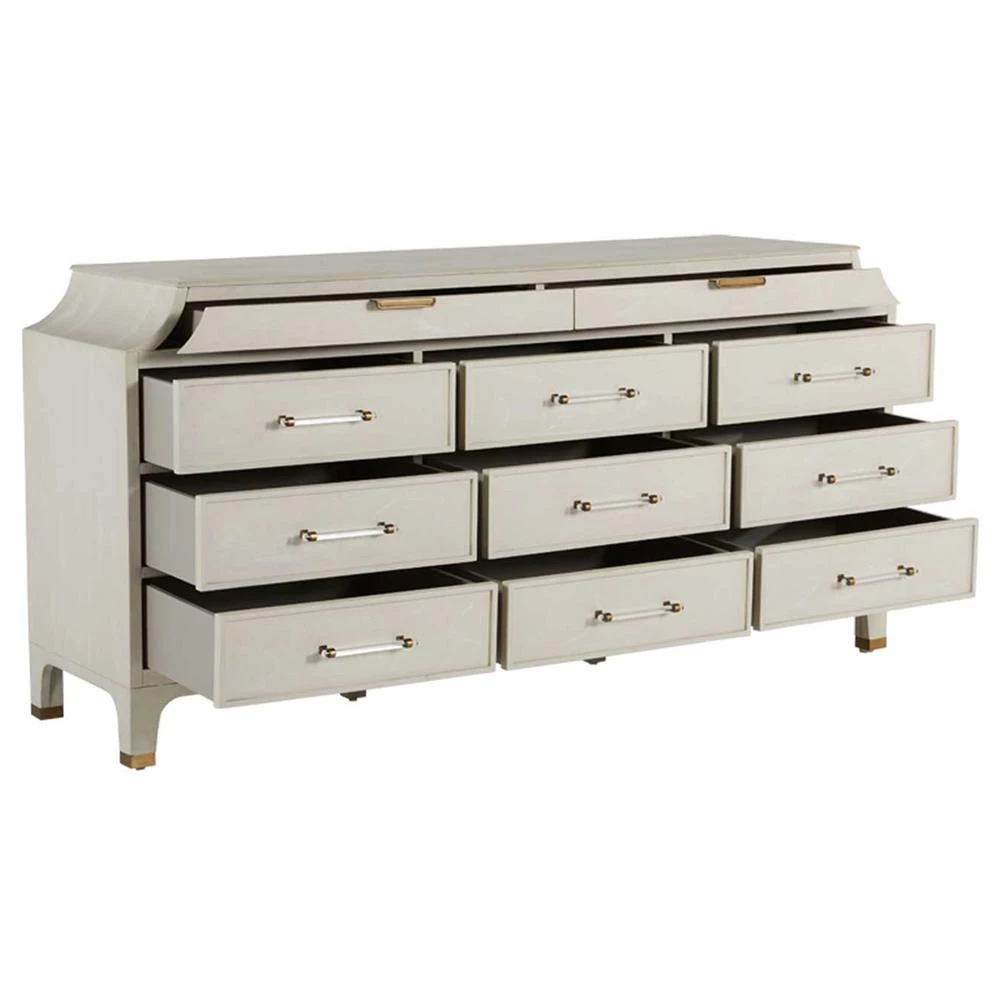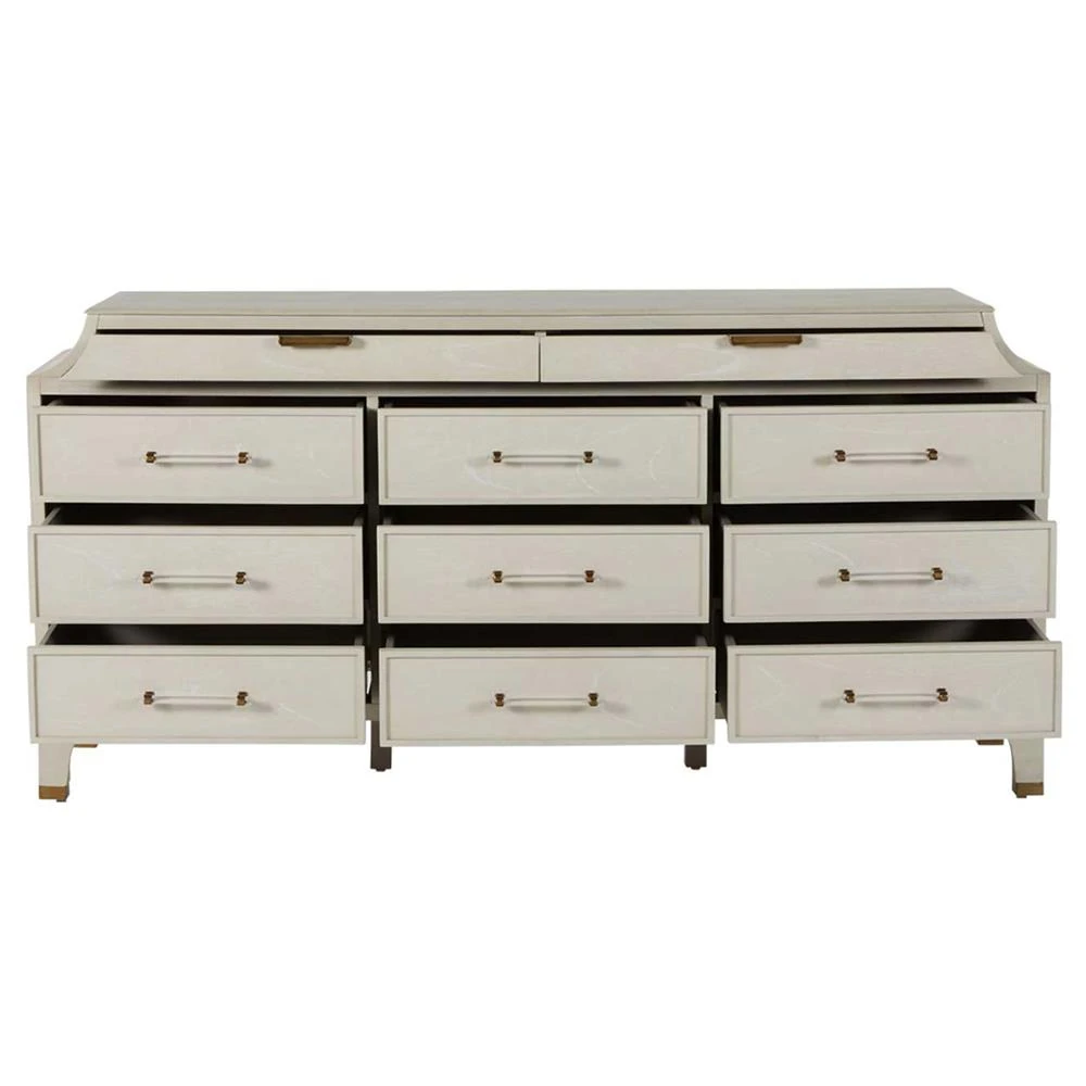 • Features 11 spacious drawers for abundant storage and and stained brass accents