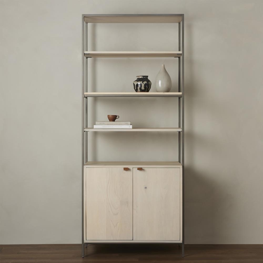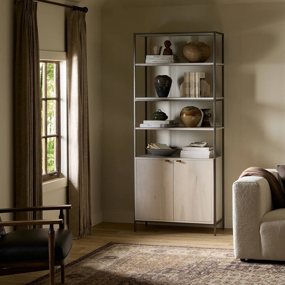 • Logen Coastal Beach Smoke Gray Oak Storage Bookcase|Kathy Kuo Home