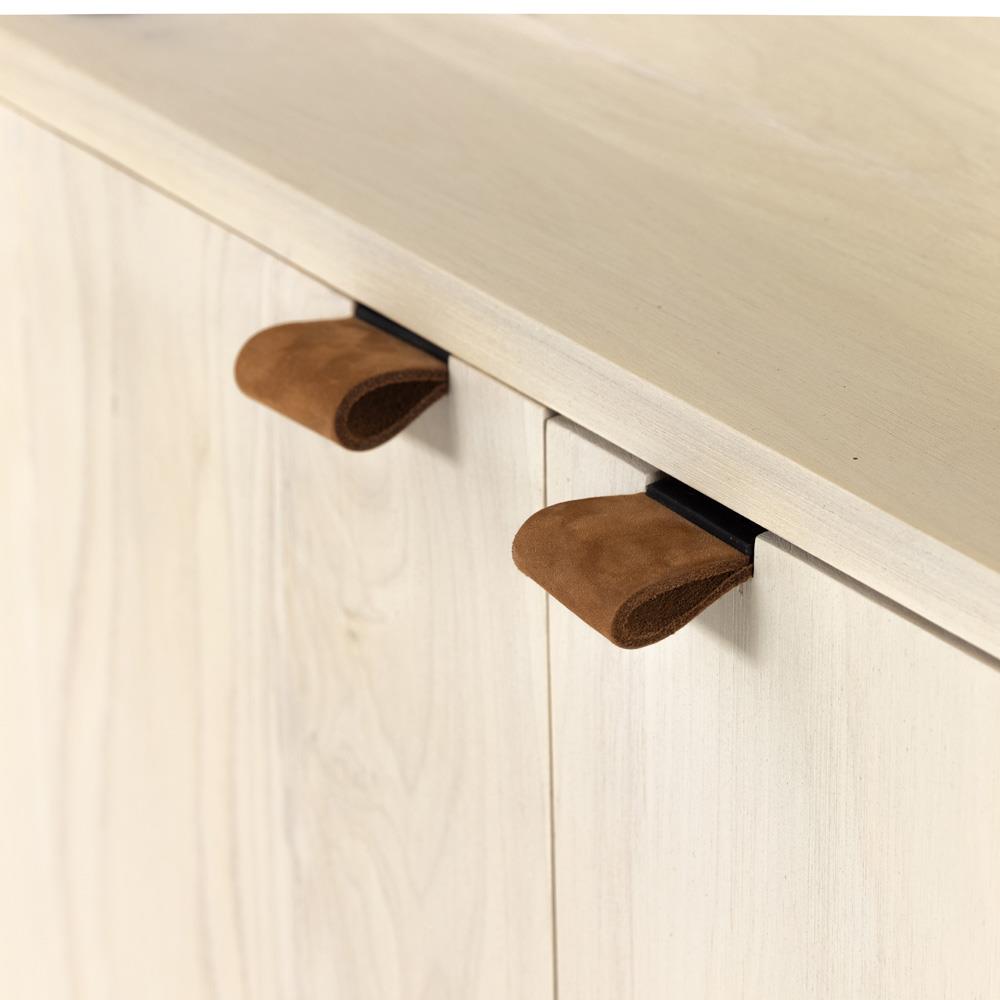 • Features raw iron frame; Features a metal secured leather pulls