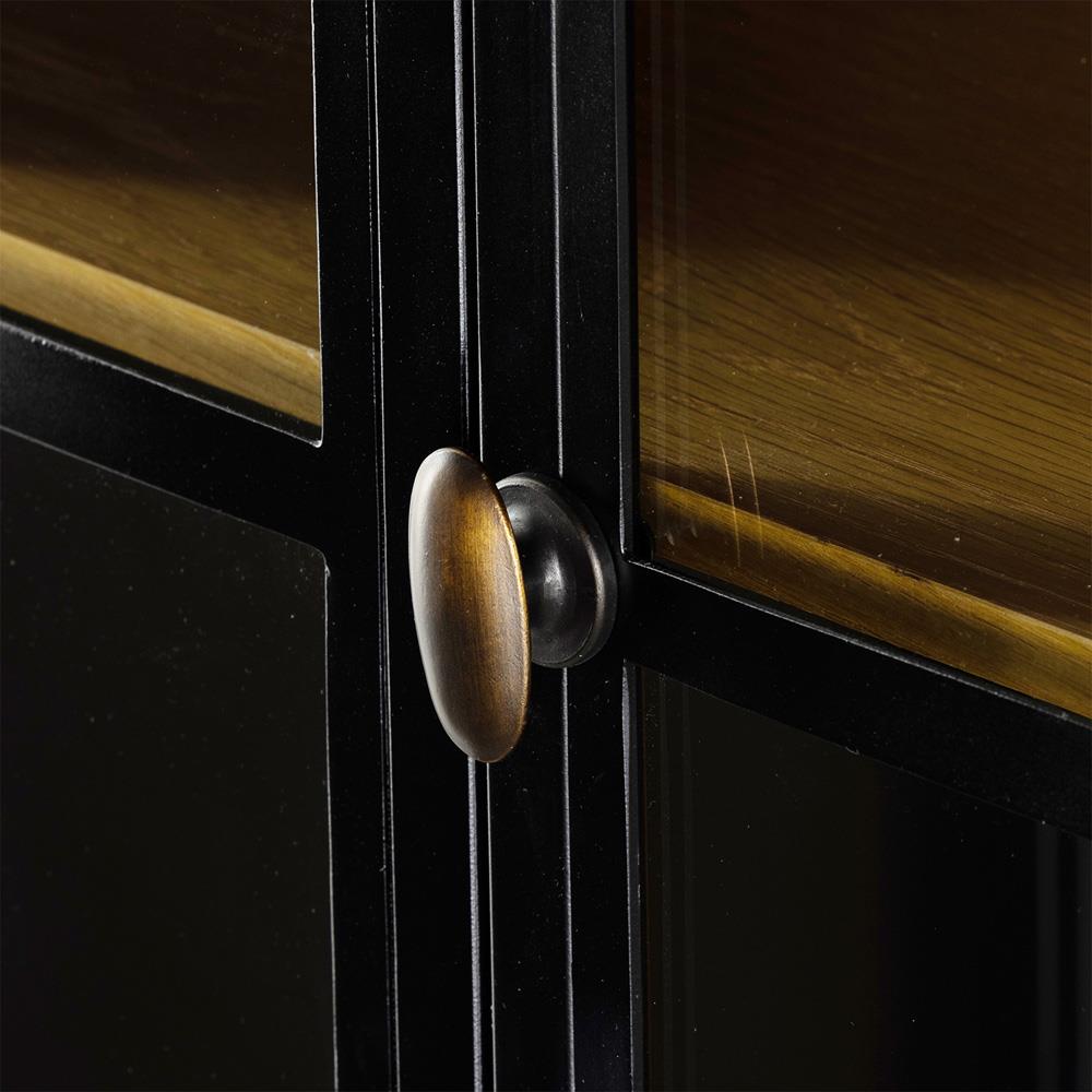 • Features glass fronts, contrasting brass hardware and wood back panel