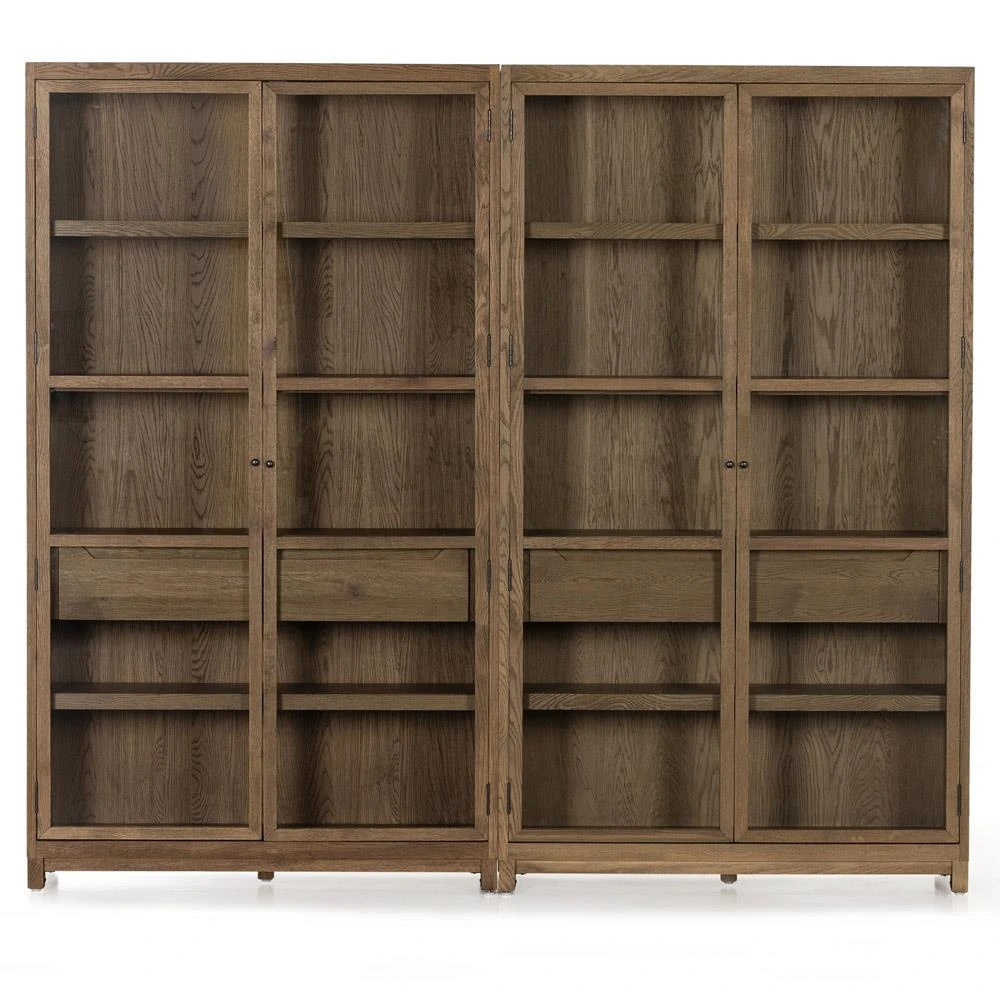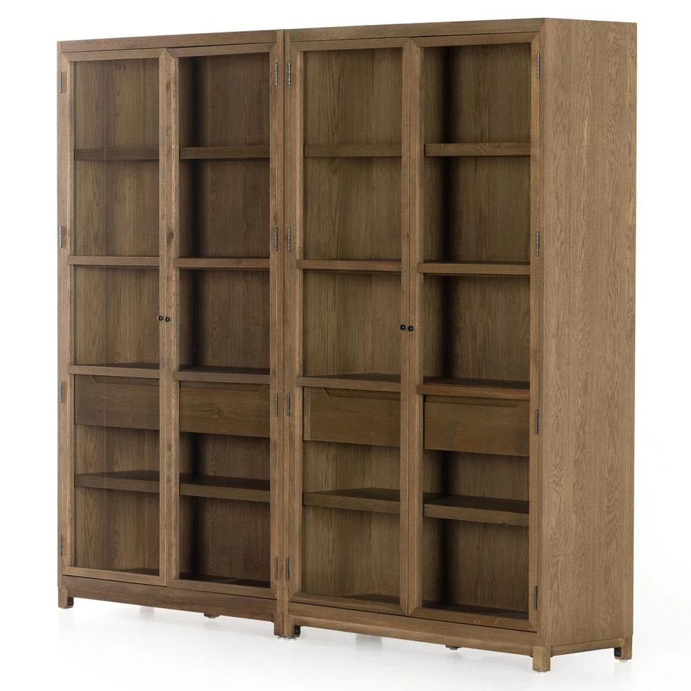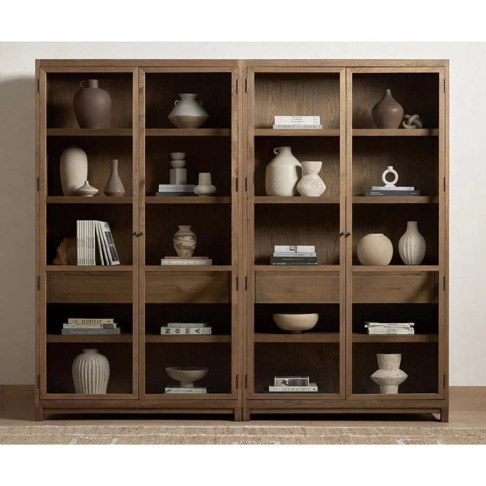 Clarence Rustic Lodge Brown Oak Wood 4 Glass Door 8 Shelf Double Display Case