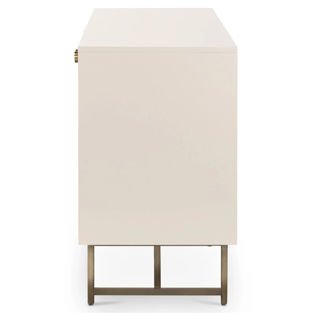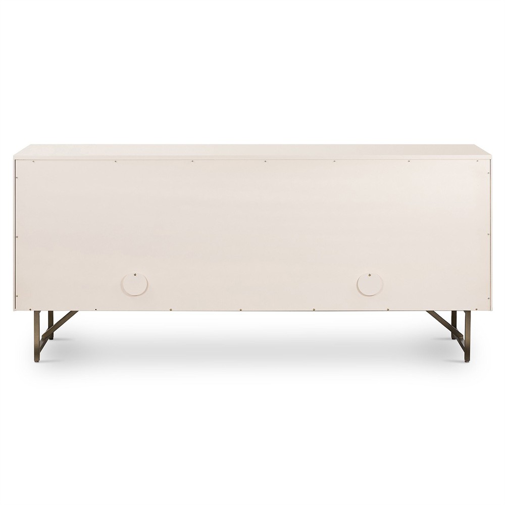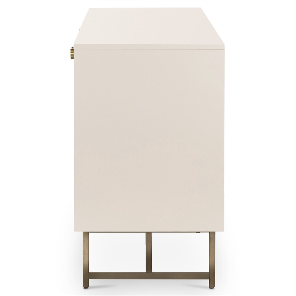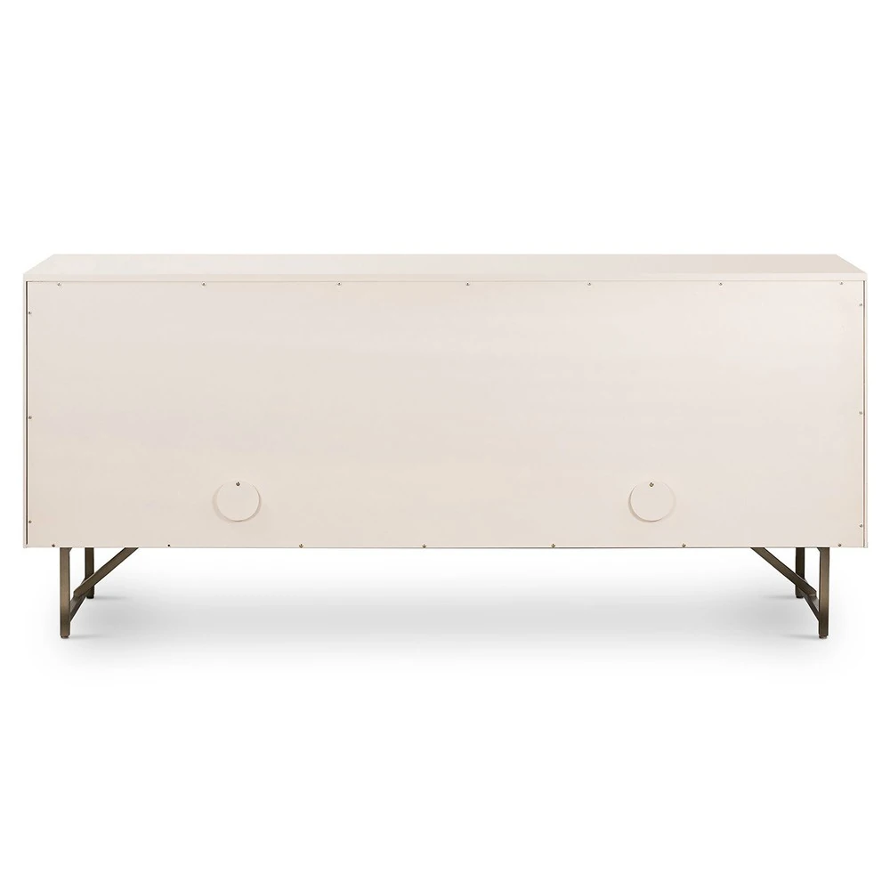 • Features a versatile off-white, an engineered hardwood dresser offers ample storage for serving ware, table linens and more, with golden brass-finished iron hardware and a stainless steel base. Rear cutouts for cord management.