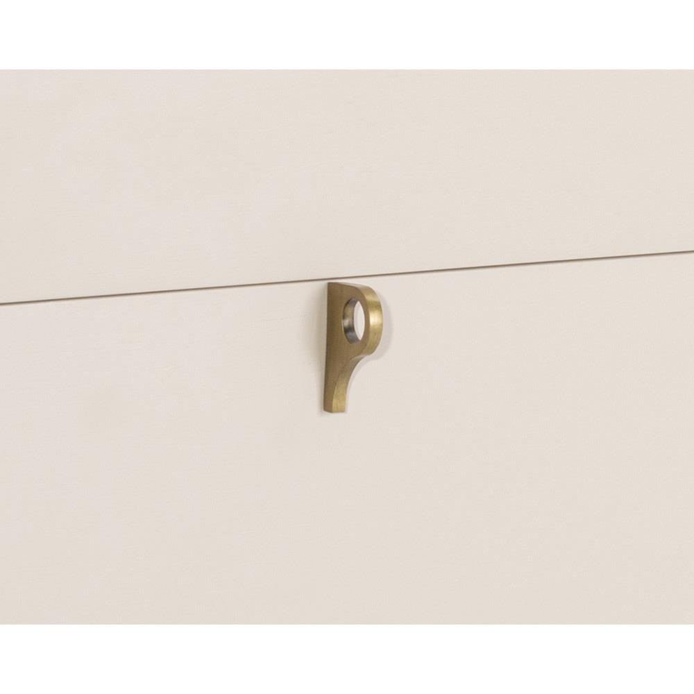 • Features a subtle wood grain texture, soft closing drawer, sculpted antique brass drawer pulls and feet