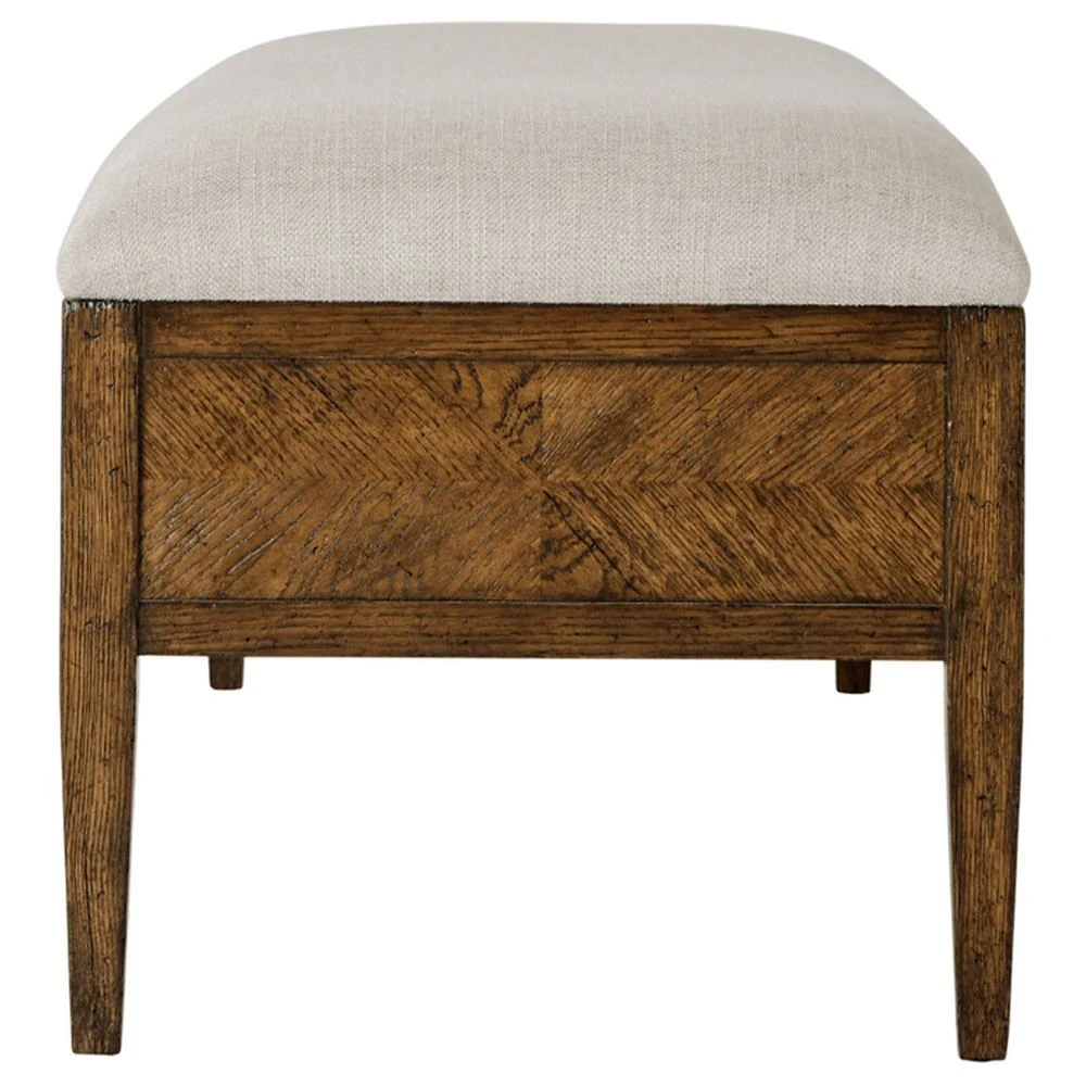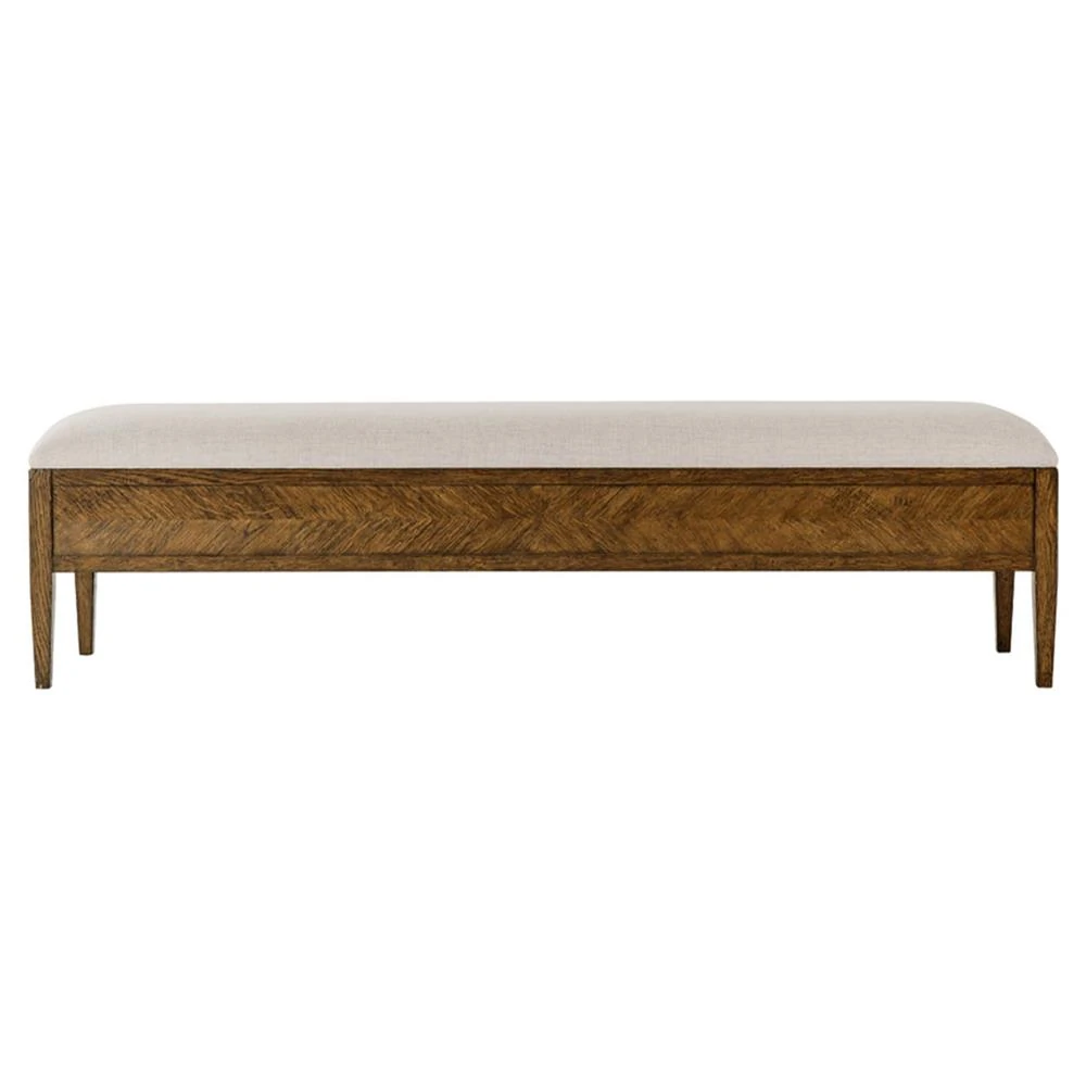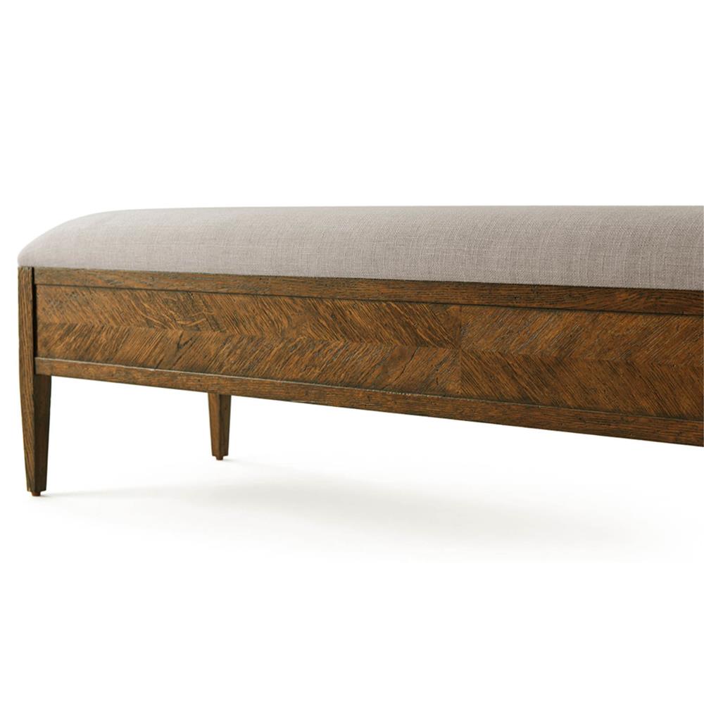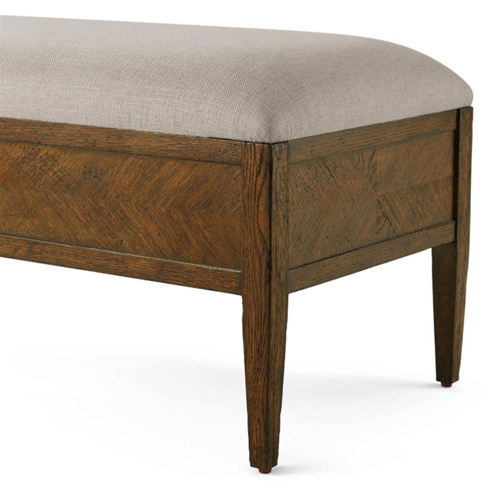 • The perfect addition to the foot of any bed, this rustic oak bench, pictured in the dusk finish, stands on tapered oak legs and features a refined upholstered seat