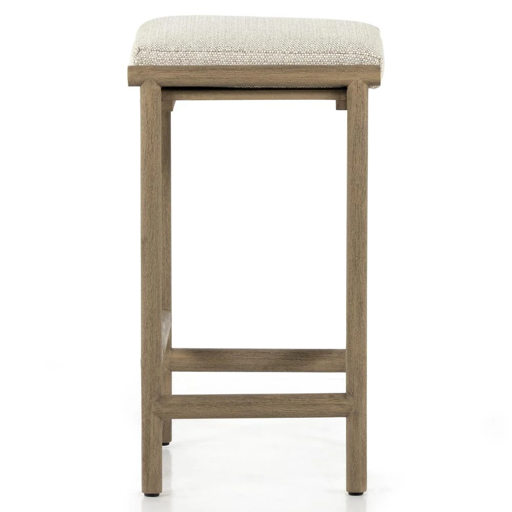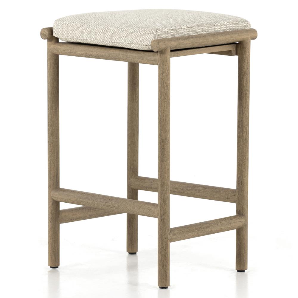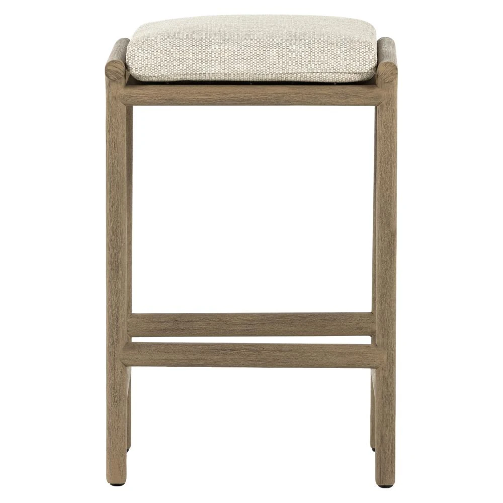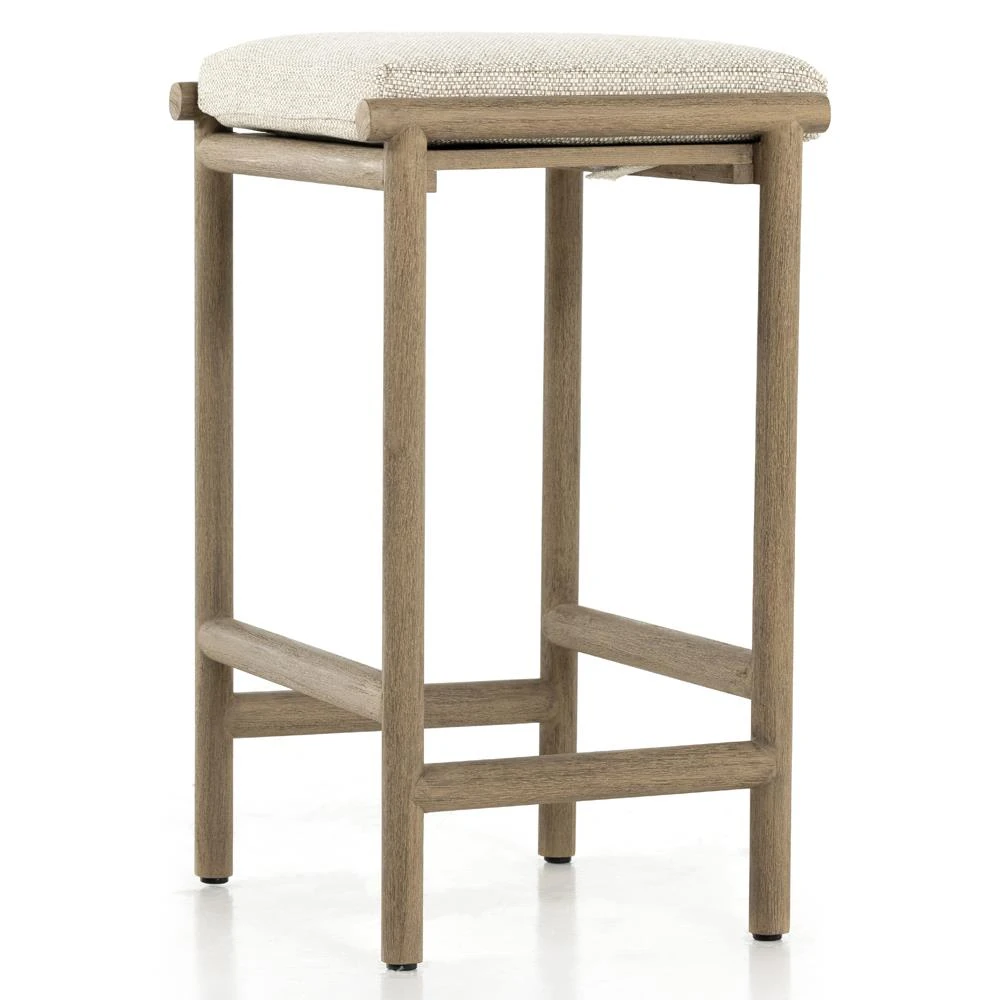 Karimm Coastal Beach Beige Upholstered Natural Teak Wood Frame Outdoor Counter Stool