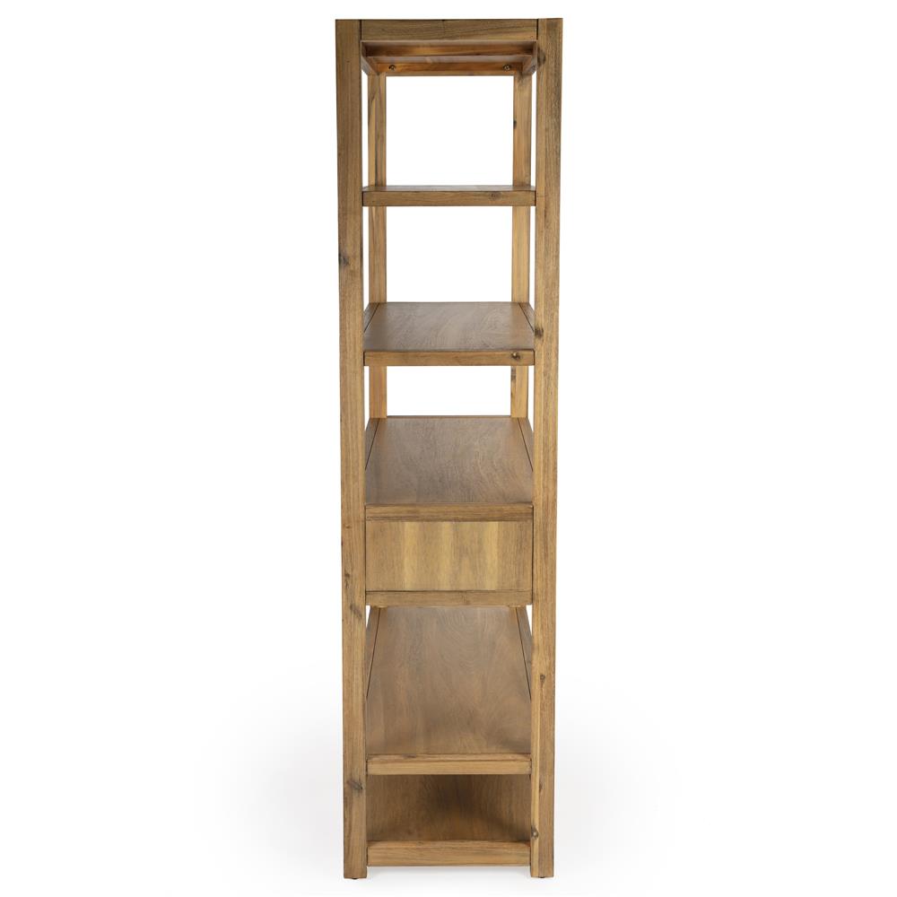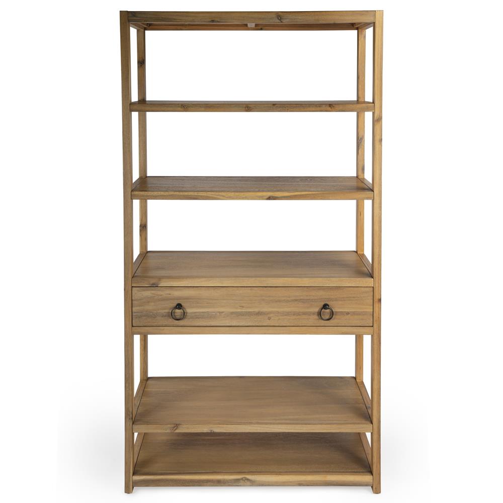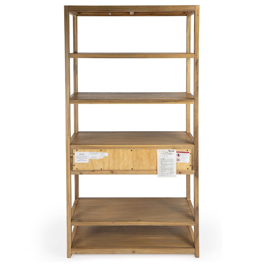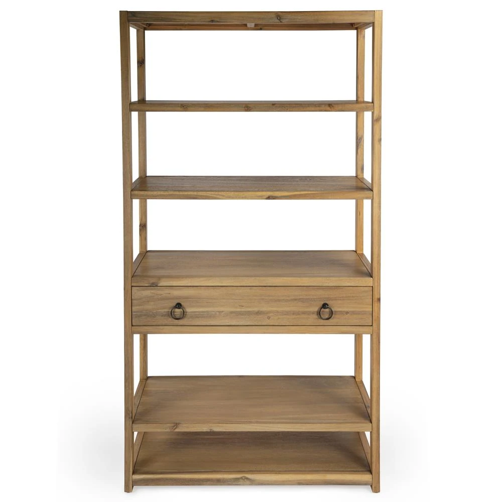 • Features 5 tiers of shelves; One oversized storage drawer with English dovetail construction