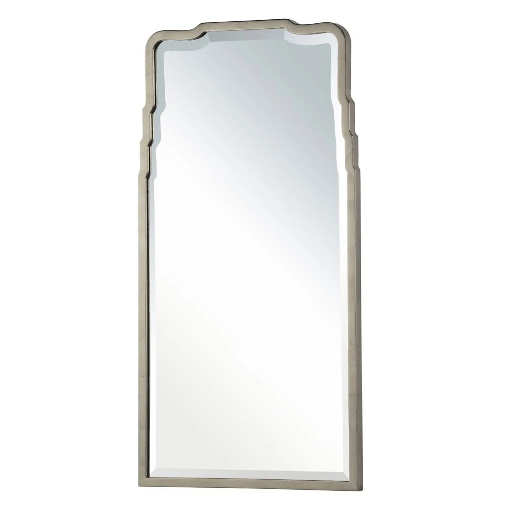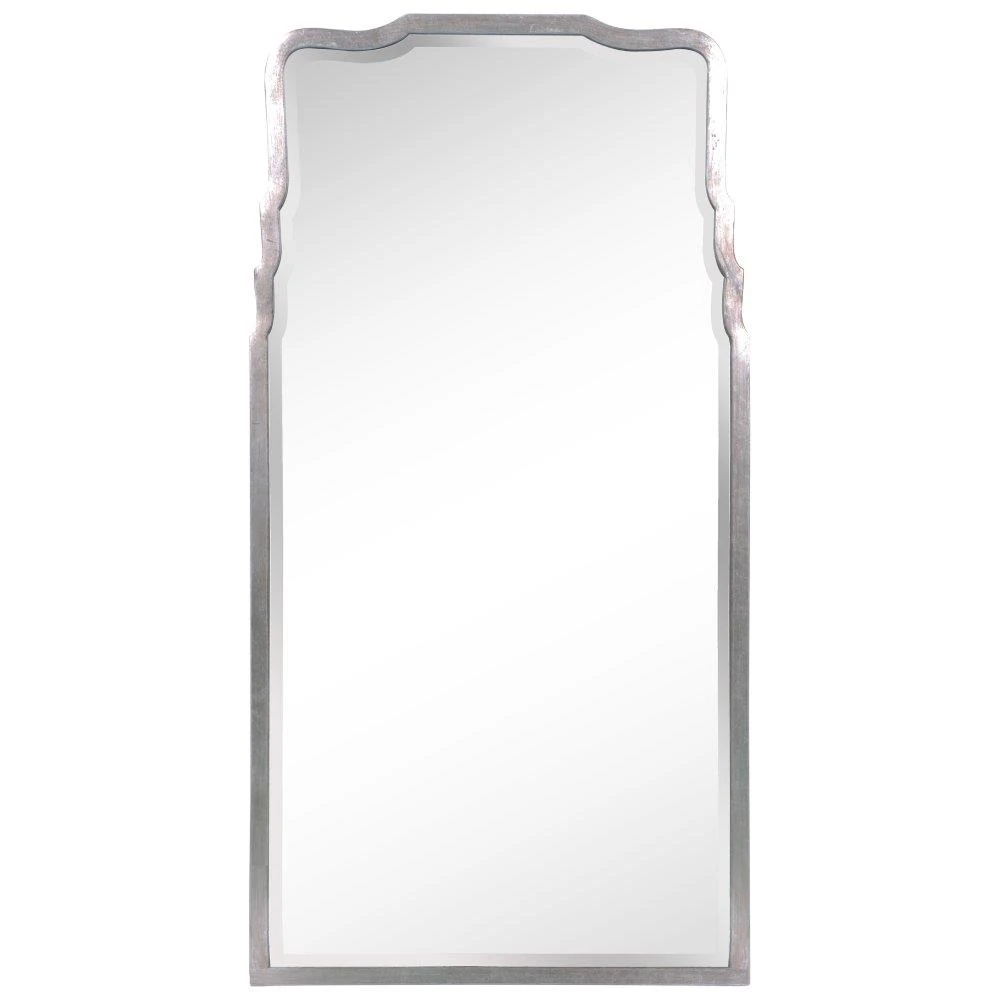 Our Ciara antiqued silver leaf iron mirror is tall, with an intricately designed frame. It adds class and elegance to a space.