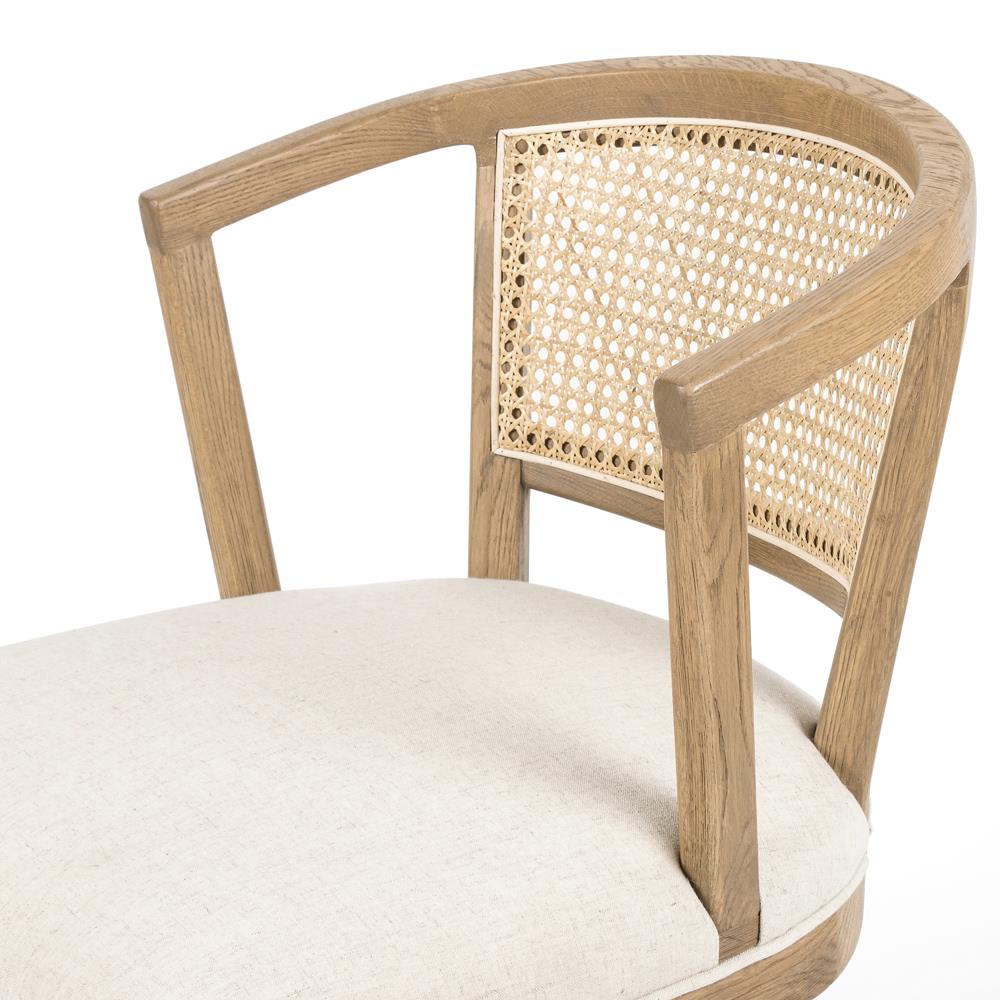 • Features light honey-finished oak frames a textural inlay of natural cane, with linen-blend seating of high-performance fabric set on a handy swivel