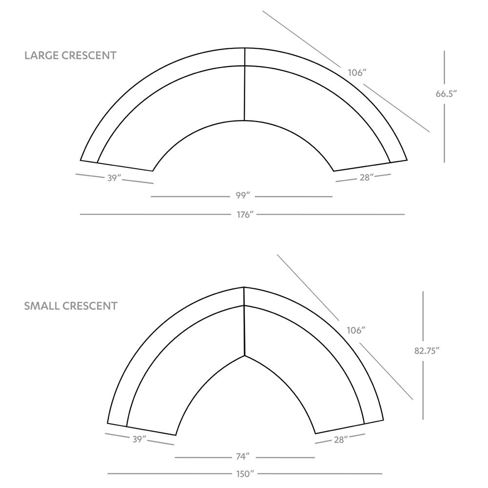 • Left Arm: 29 inches high x 106 inches wide x 45 inches deep; Right Arm: 29 inches high x 106 inches wide x 45 inches deep; Large crescent: 29 inches high x 176.38 inches wide x 66.5 inches deep; Small crescent: 29 inches high x 150 inches wide x 82.75 inches deep; Seat: 17 inches high x 28 inches deep; Distance across one piece: 106 inches