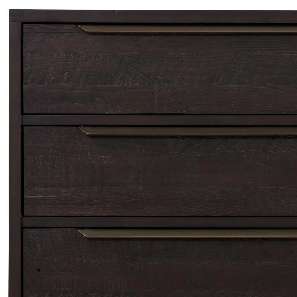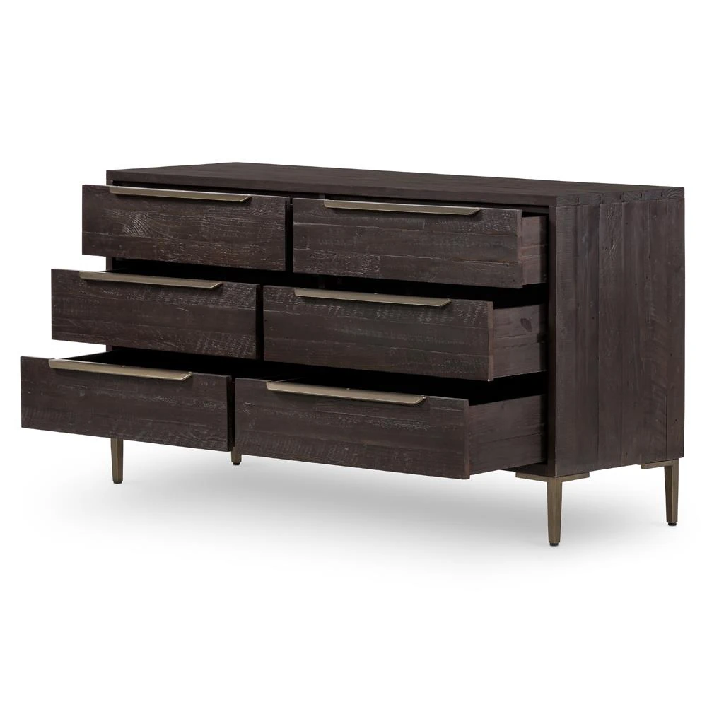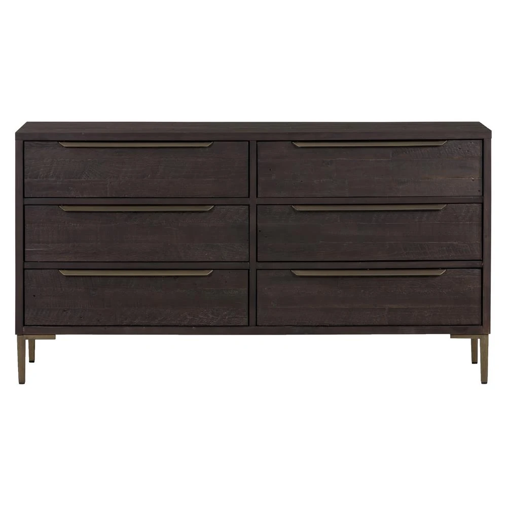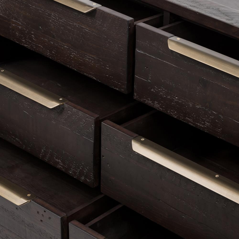 Yvette Rustic Dark Brown Reclaimed Pine Wood Gold Iron 6 Drawer Double Dresser