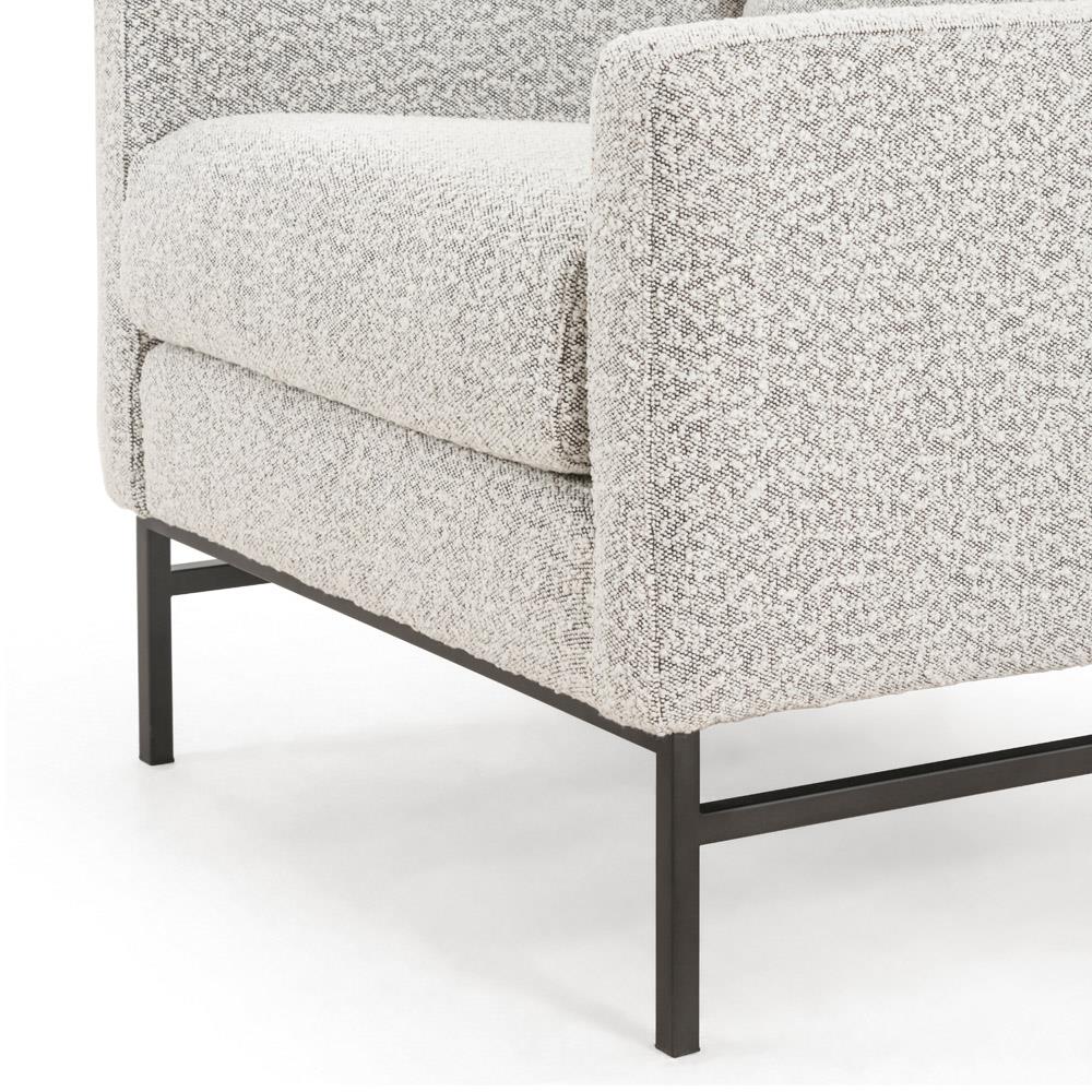 • Features black-finished iron base, thick, boucle-like upholstery and angular track arms