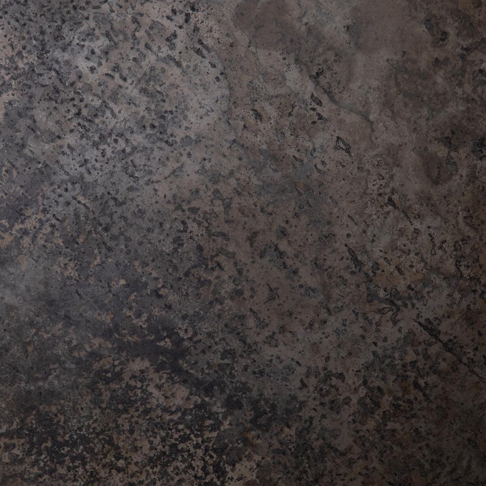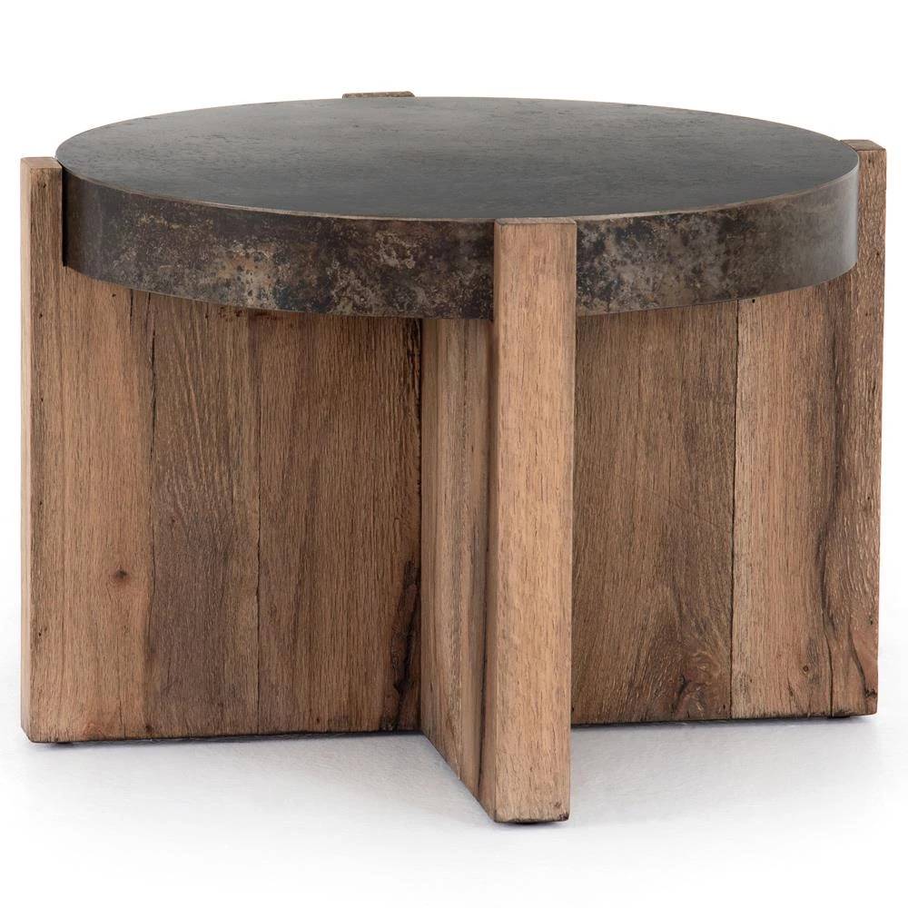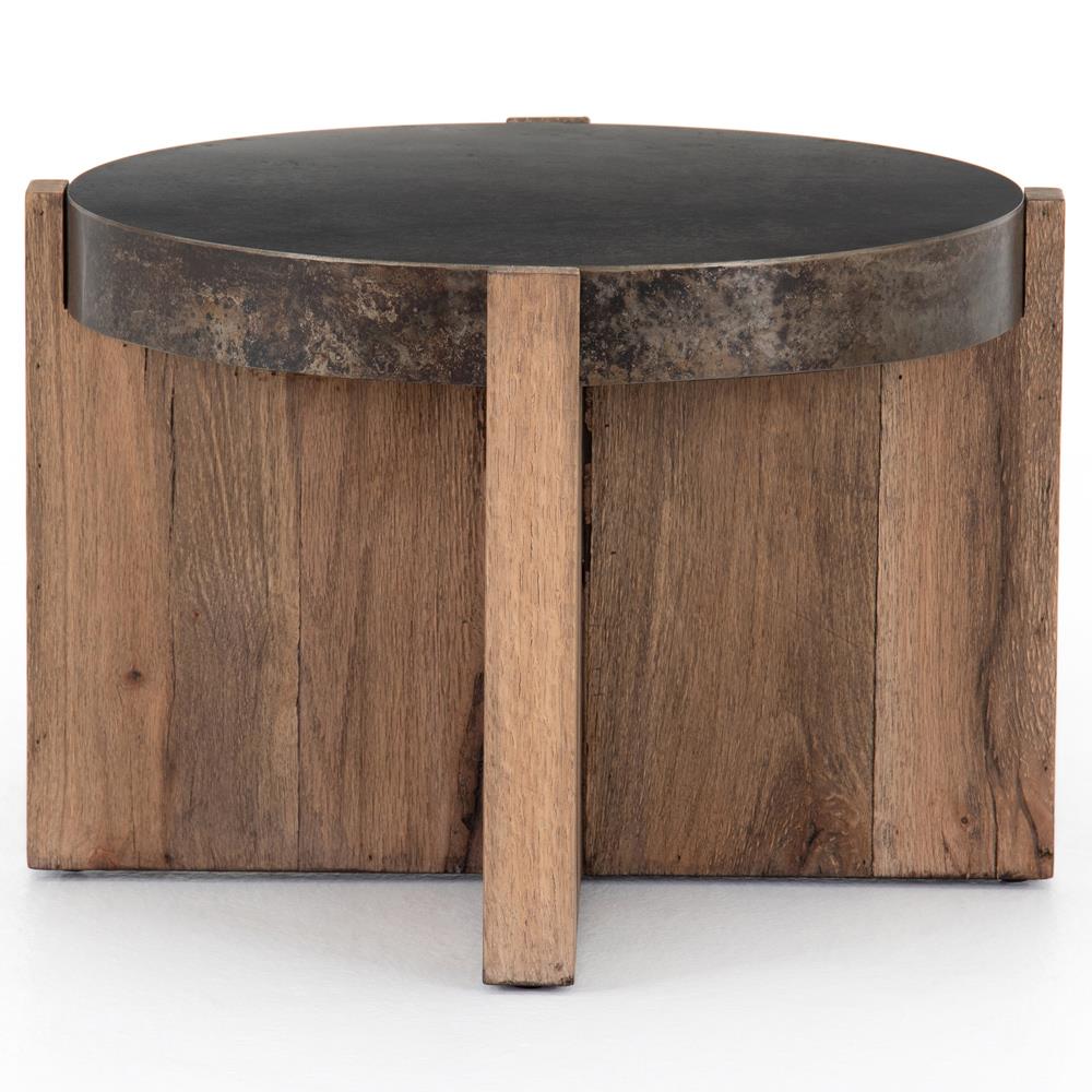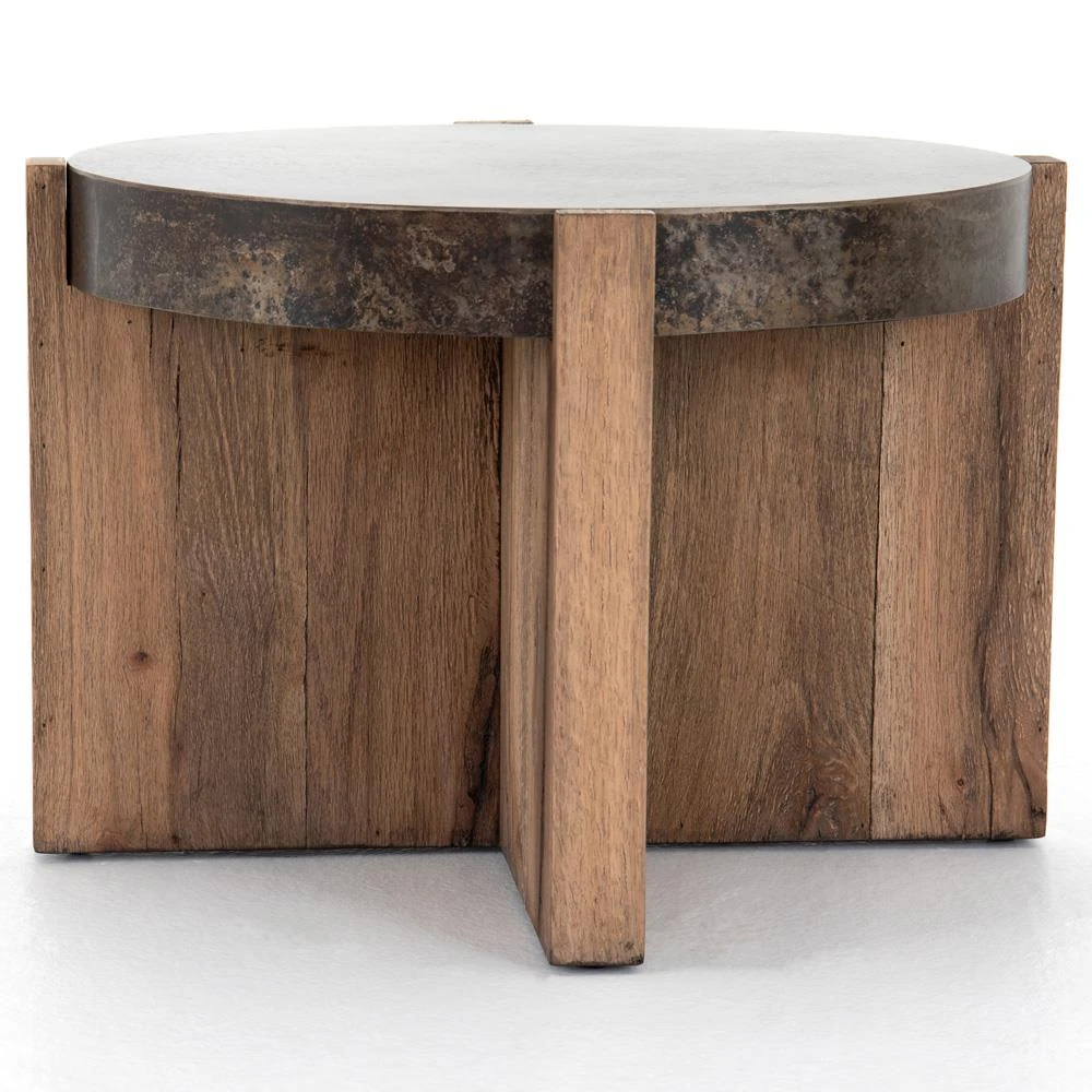 • Features round tabletop of distressed iron rests within a sculptural cradle base of rustic, character-rich oak with beautiful highs and lows