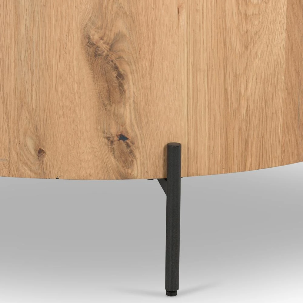 • Features a cradle base of gunmetal-finished iron supports a rounded coffee table shaped from thick oak veneer