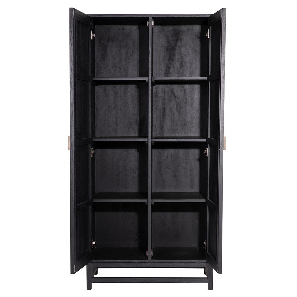 • Featuring its antique black frame with natural rattan door panels, 4 shelves