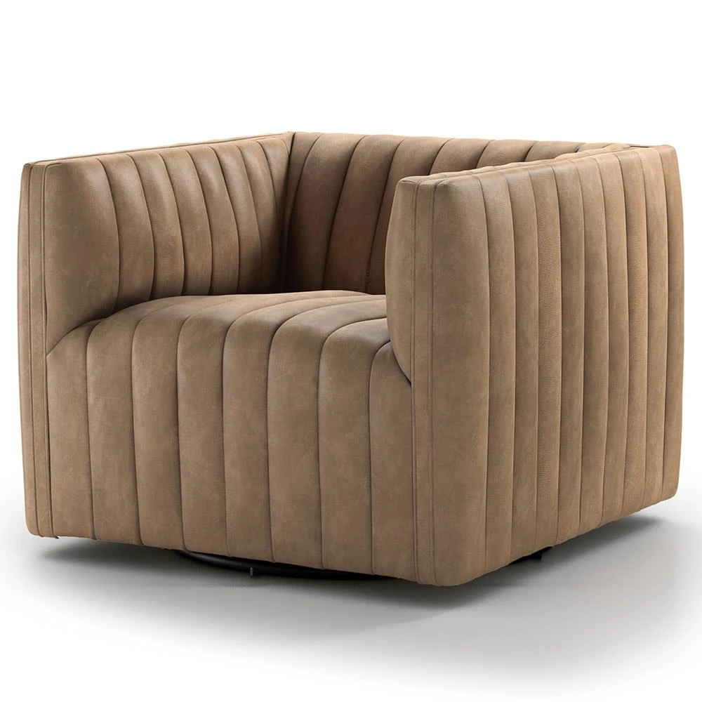 With a swivel base and elevated channel tufting, the Leo chair enlivens a classic silhouette. Its poplar plywood frame is topped with b ... more