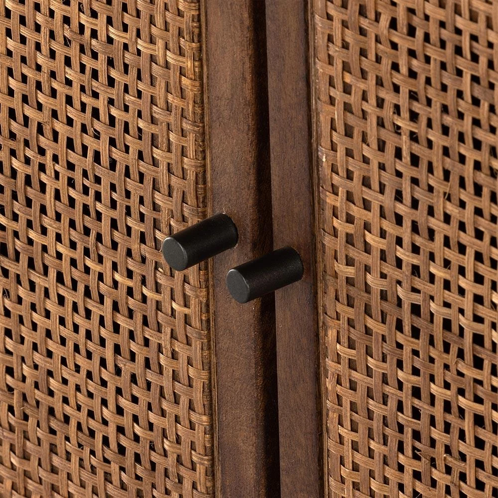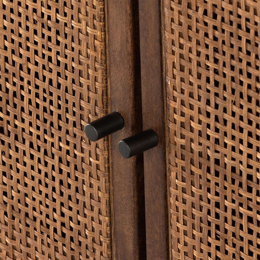 • Features a brown mango wood casing, cane weave door detailing, and angular gunmetal-finished iron legs