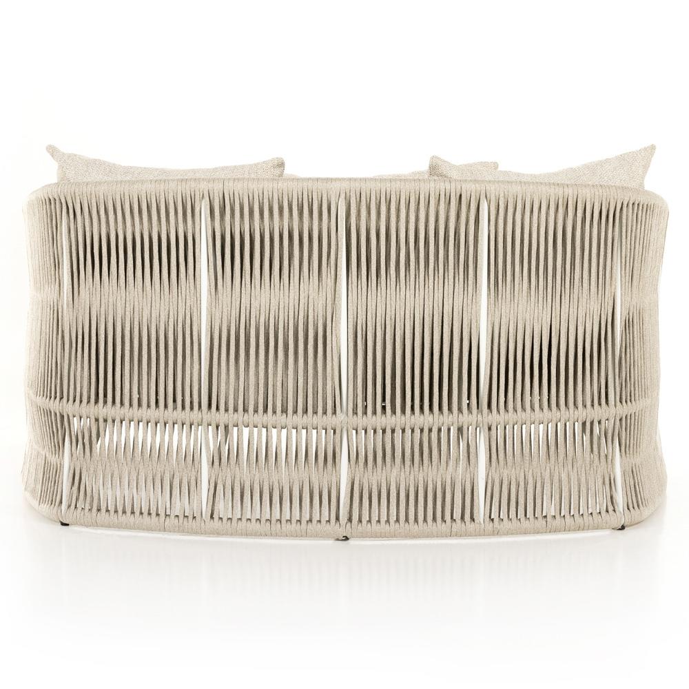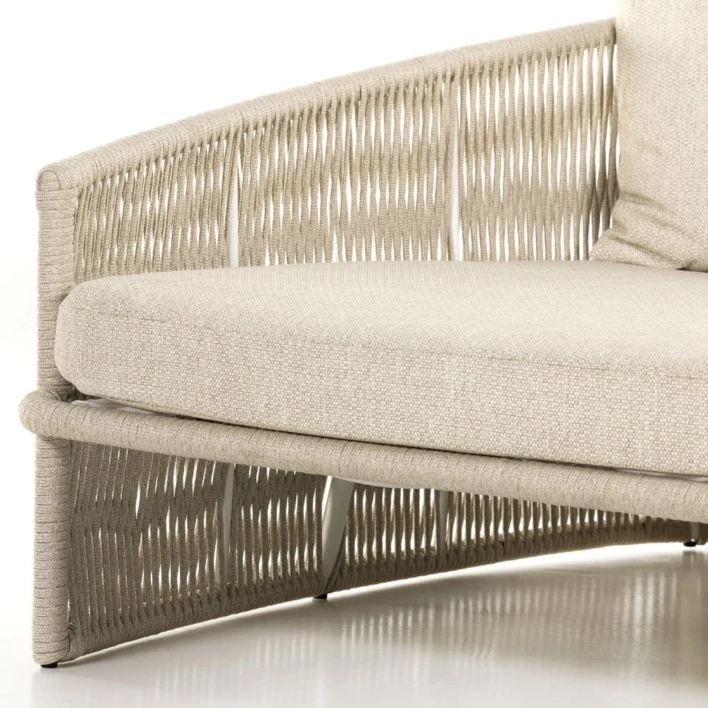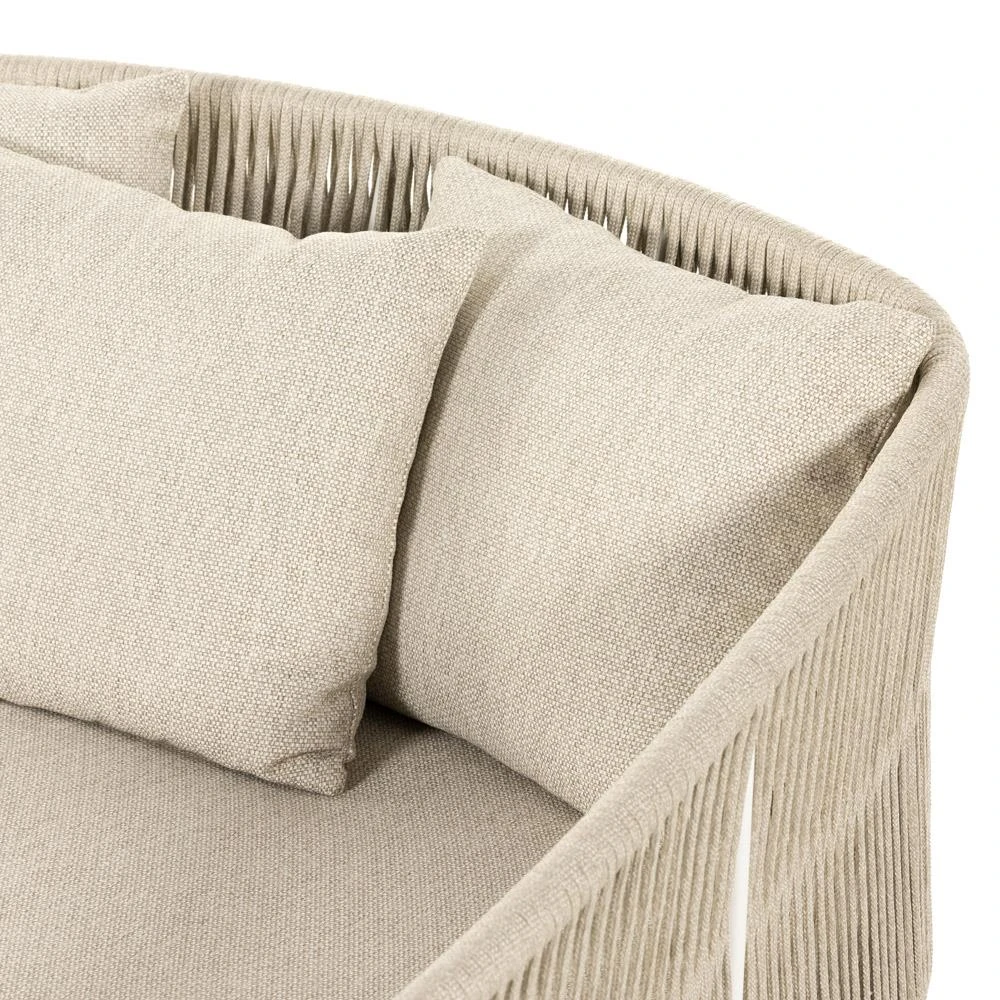 • Features a rope-based design is woven across a durable aluminum frame, topped with a wide cushion and throw pillows, upholstered in UV-resistant, water-repellent, and quick-drying 100% olefin