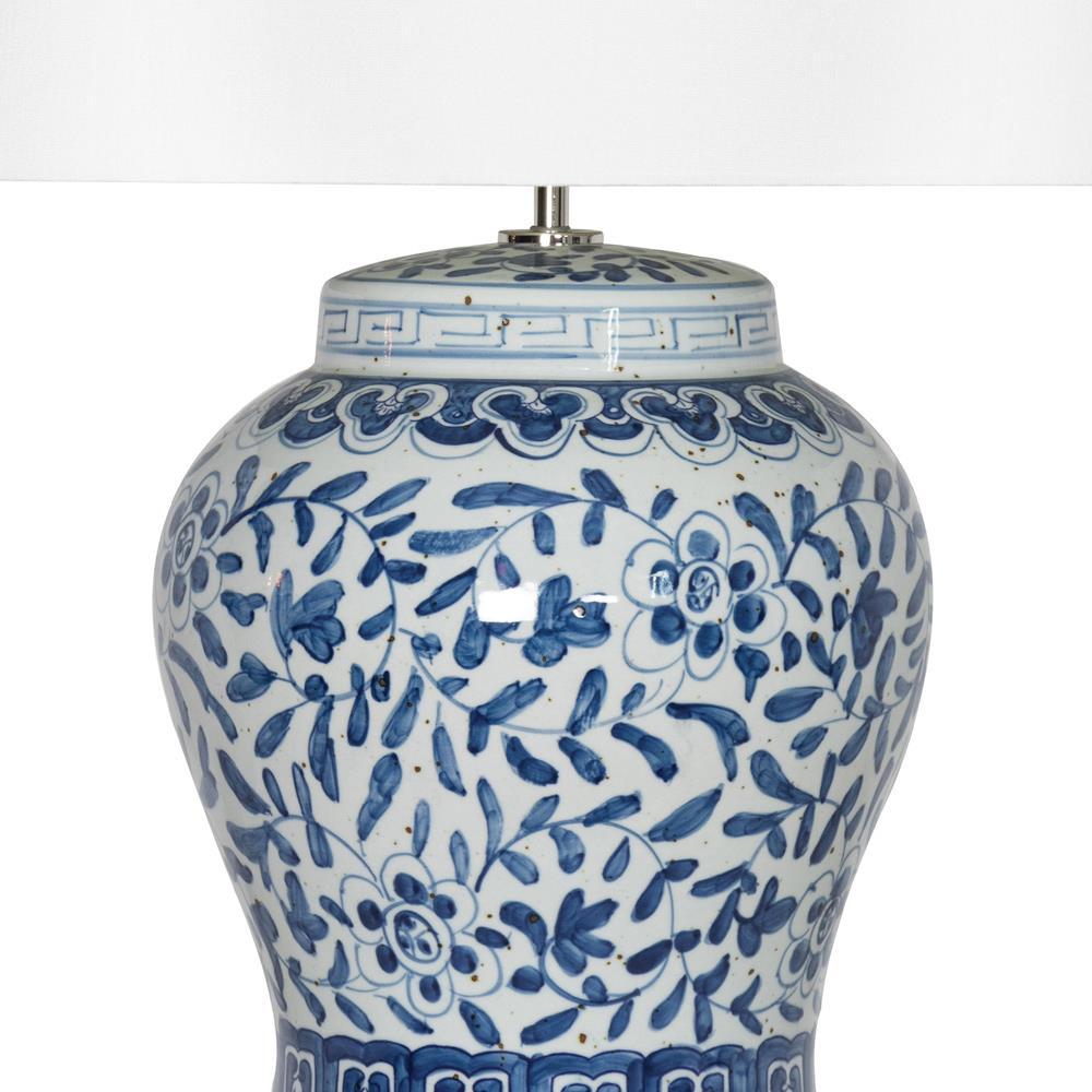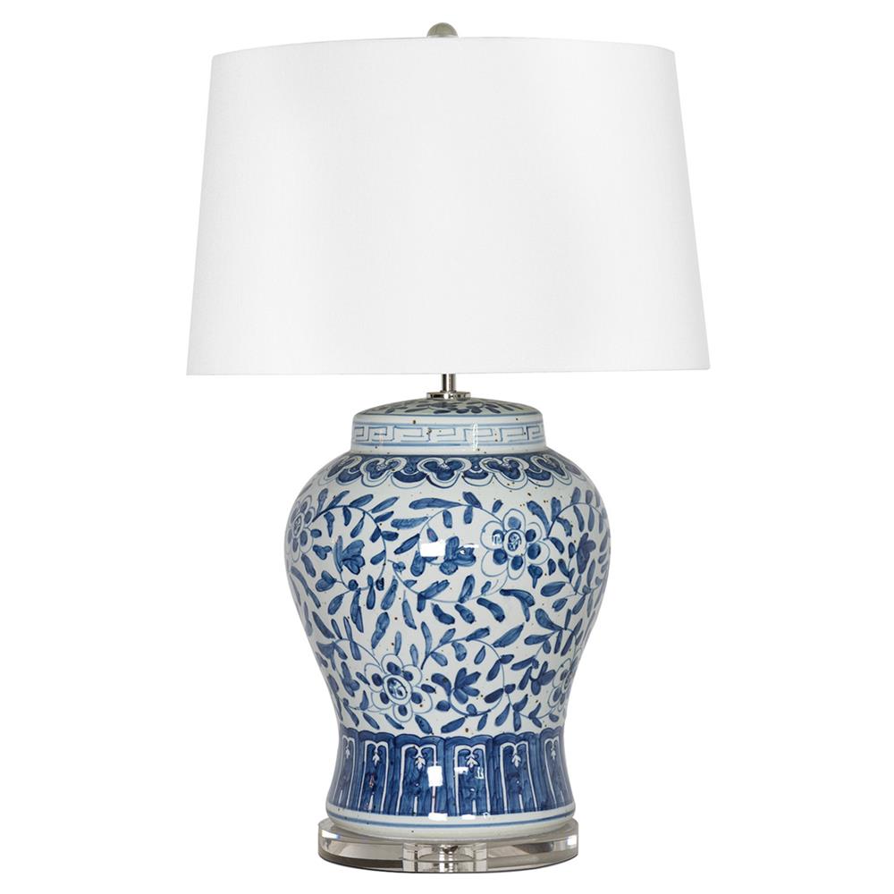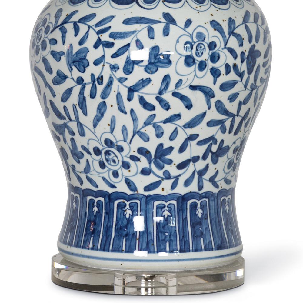 • Features a natural linen hardback shade with rolled edges, a blue floral design inspired by traditional Chinese vases and a crystal base