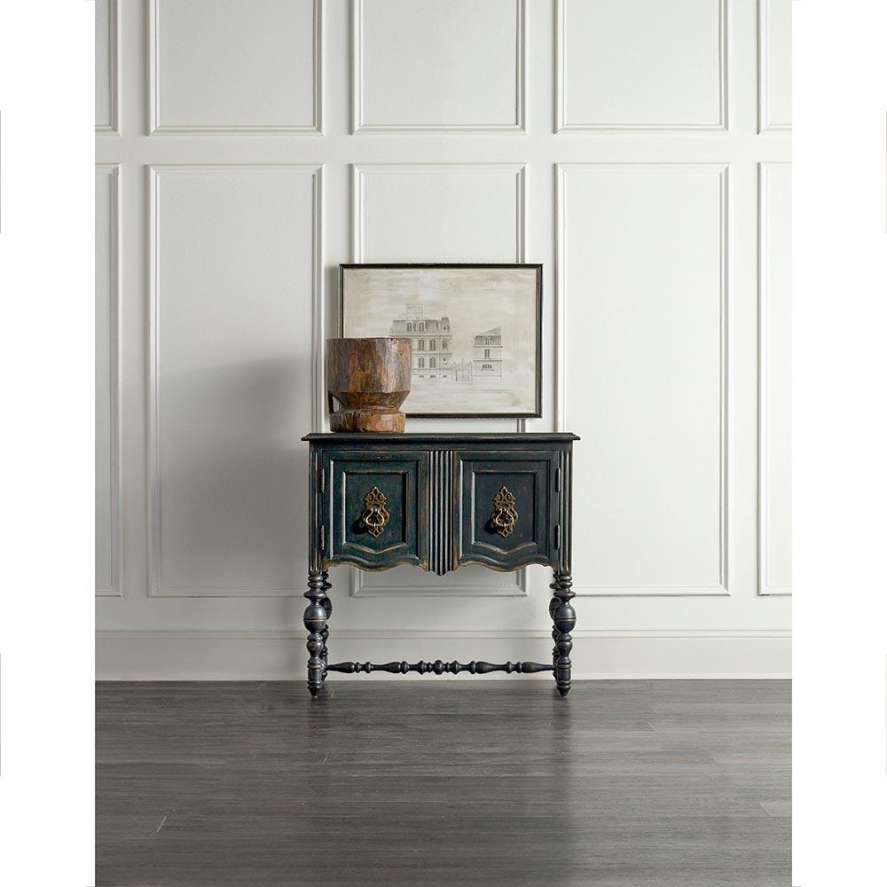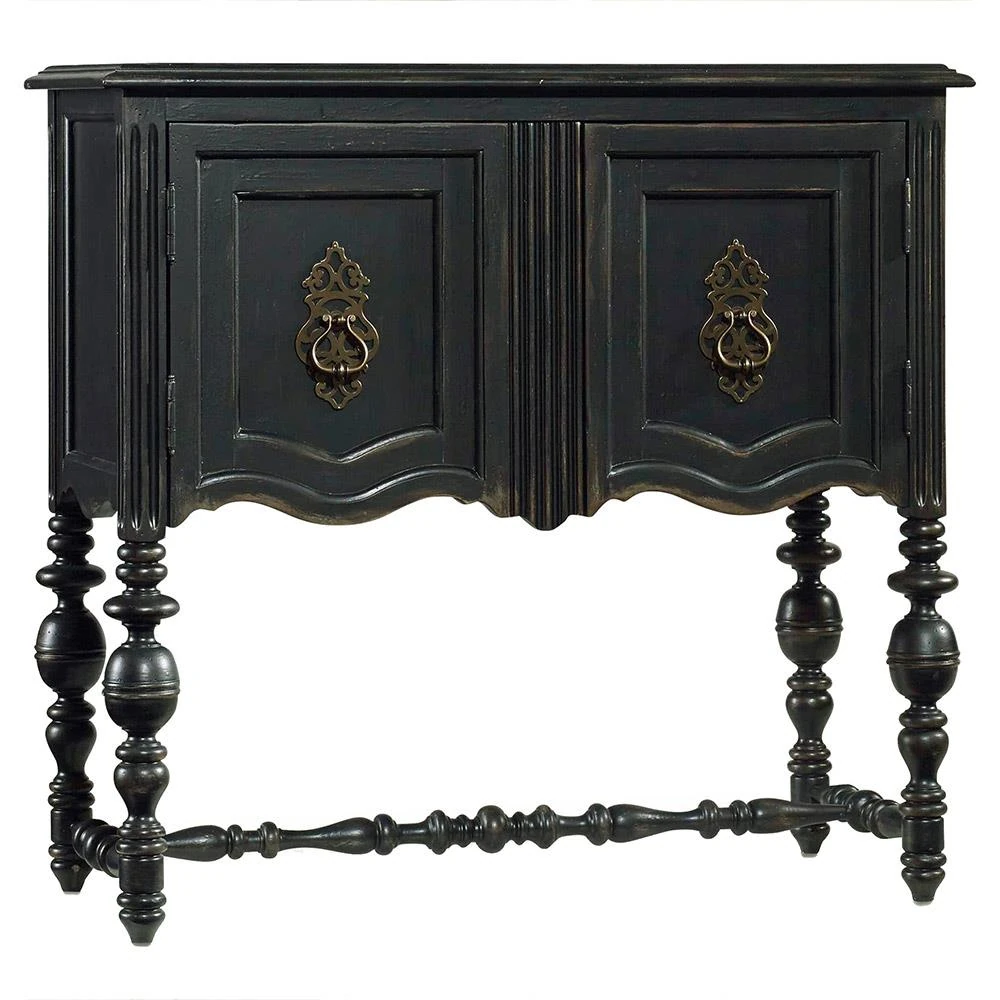 • Features (2) x doors with ring pulls on decorative back plates and 1 adjustable shelf; Hand-painted, turned legs, stretcher and a shaped base
