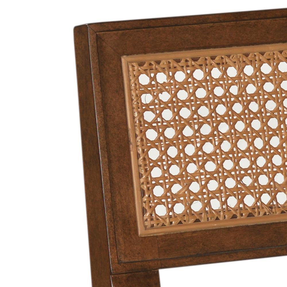 • Features an upholstered seat elevated on 6 gracefully tapering turned legs below an angled back frame fitted with natural open cane