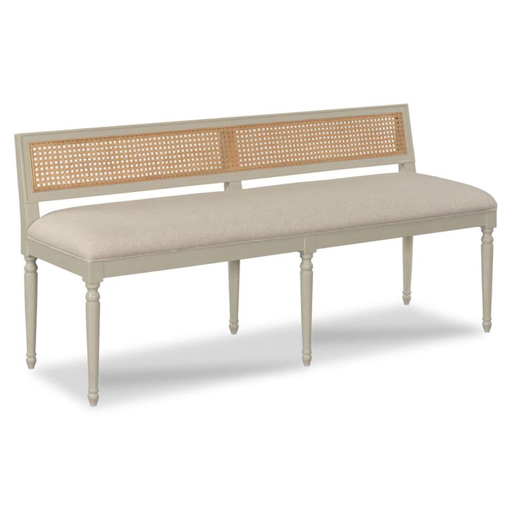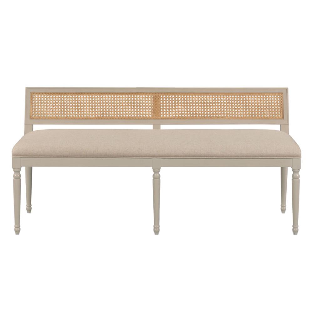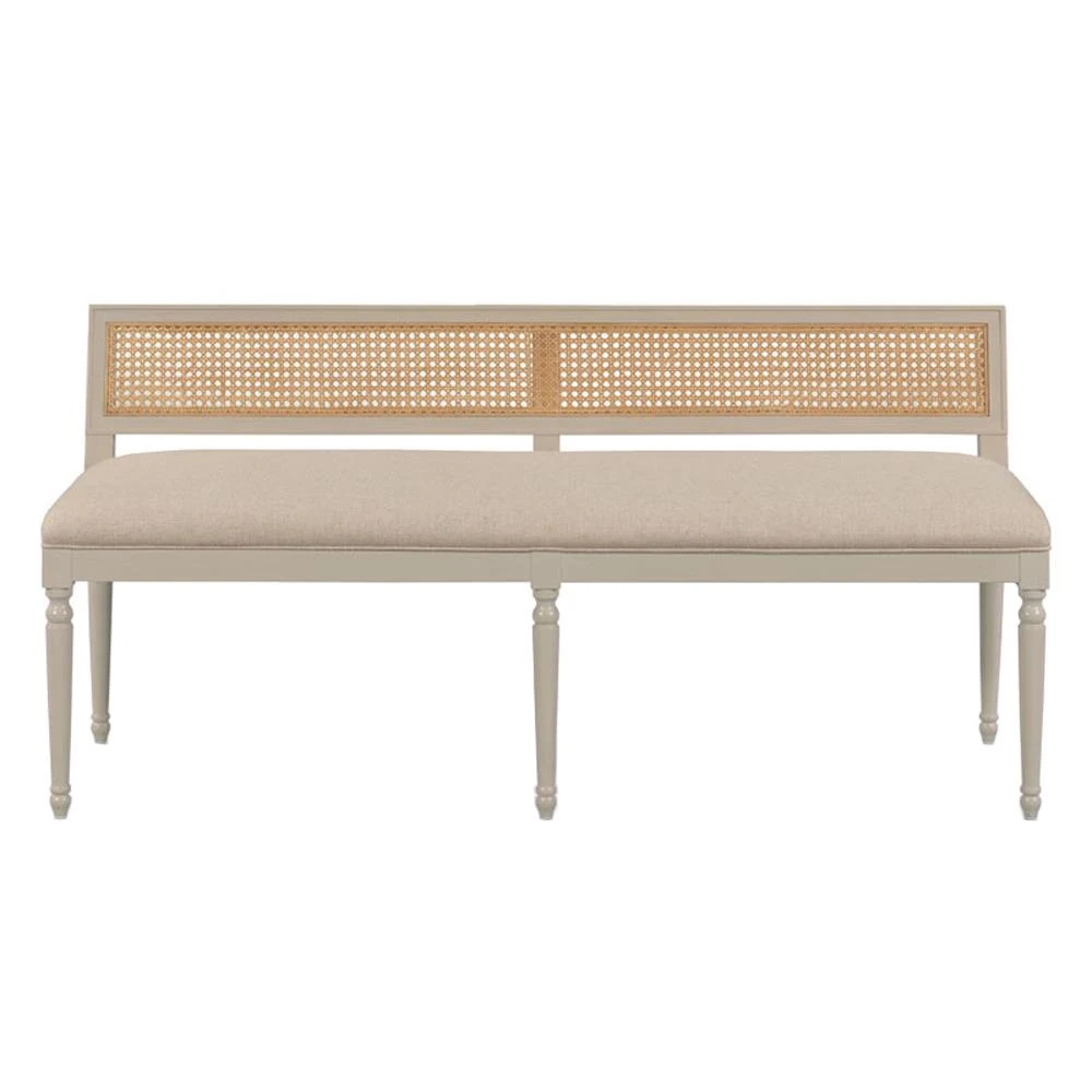 • Colette French Beige Upholstered Linen Woven Cane Brown Wood Dining Bench|Kathy Kuo Home
