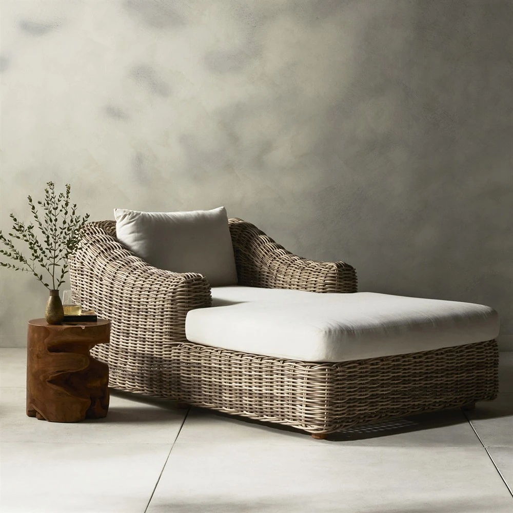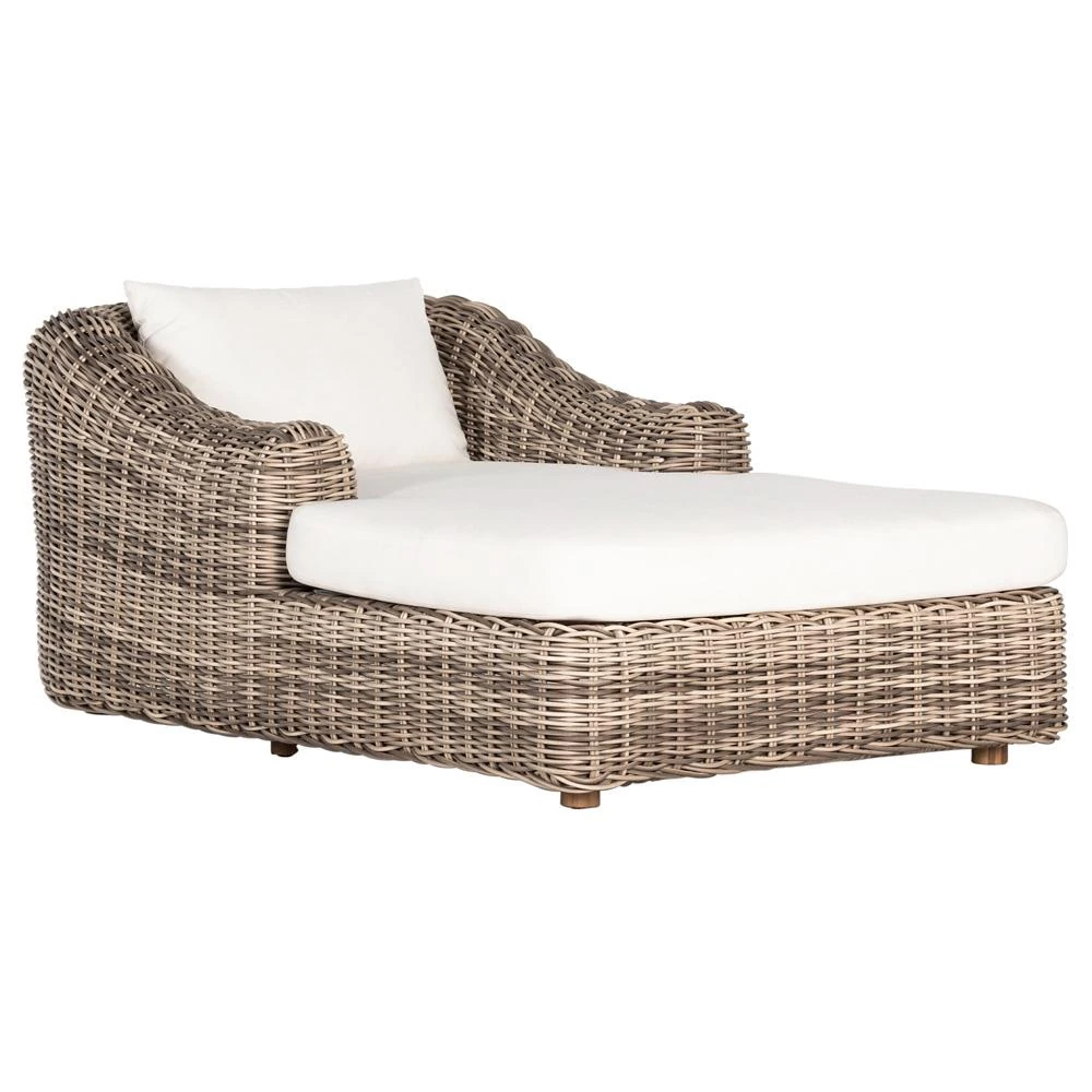 • Rina Ellen Coastal White Upholstered Natural Rattan Outdoor Lounge Chaise|Kathy Kuo Home