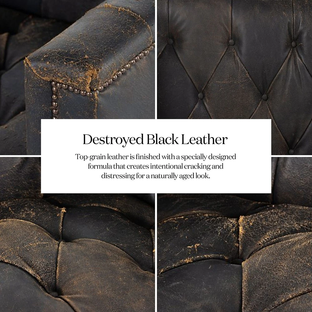 • Upholstered in "Destroyed Black" top grain leather; Filling in body: 90% polyurethane foam and 10% polyester fiber and has a firm sit