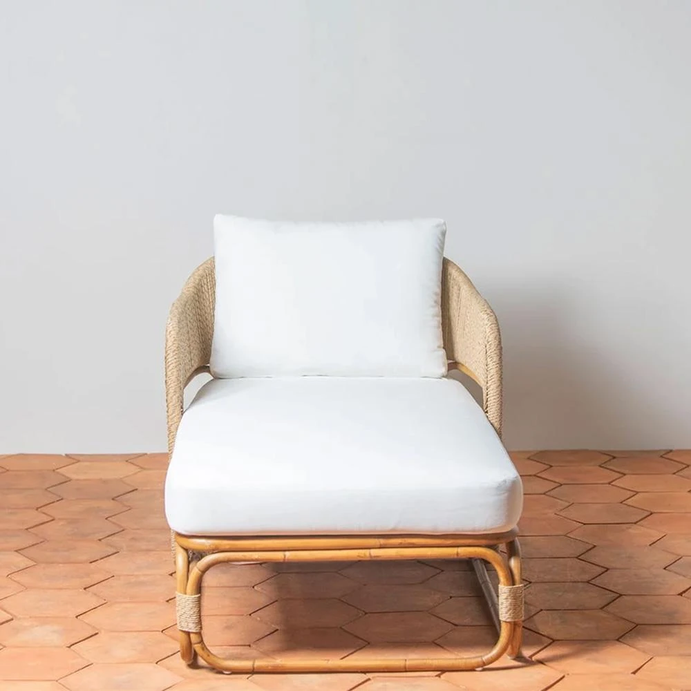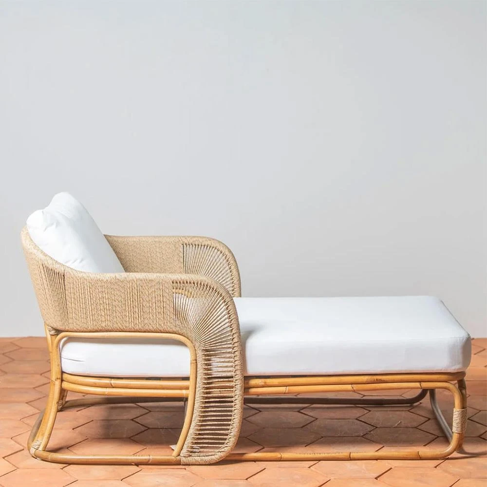 Rina Ellen Coastal White Upholstered Natural Rattan Outdoor Lounge Chaise
