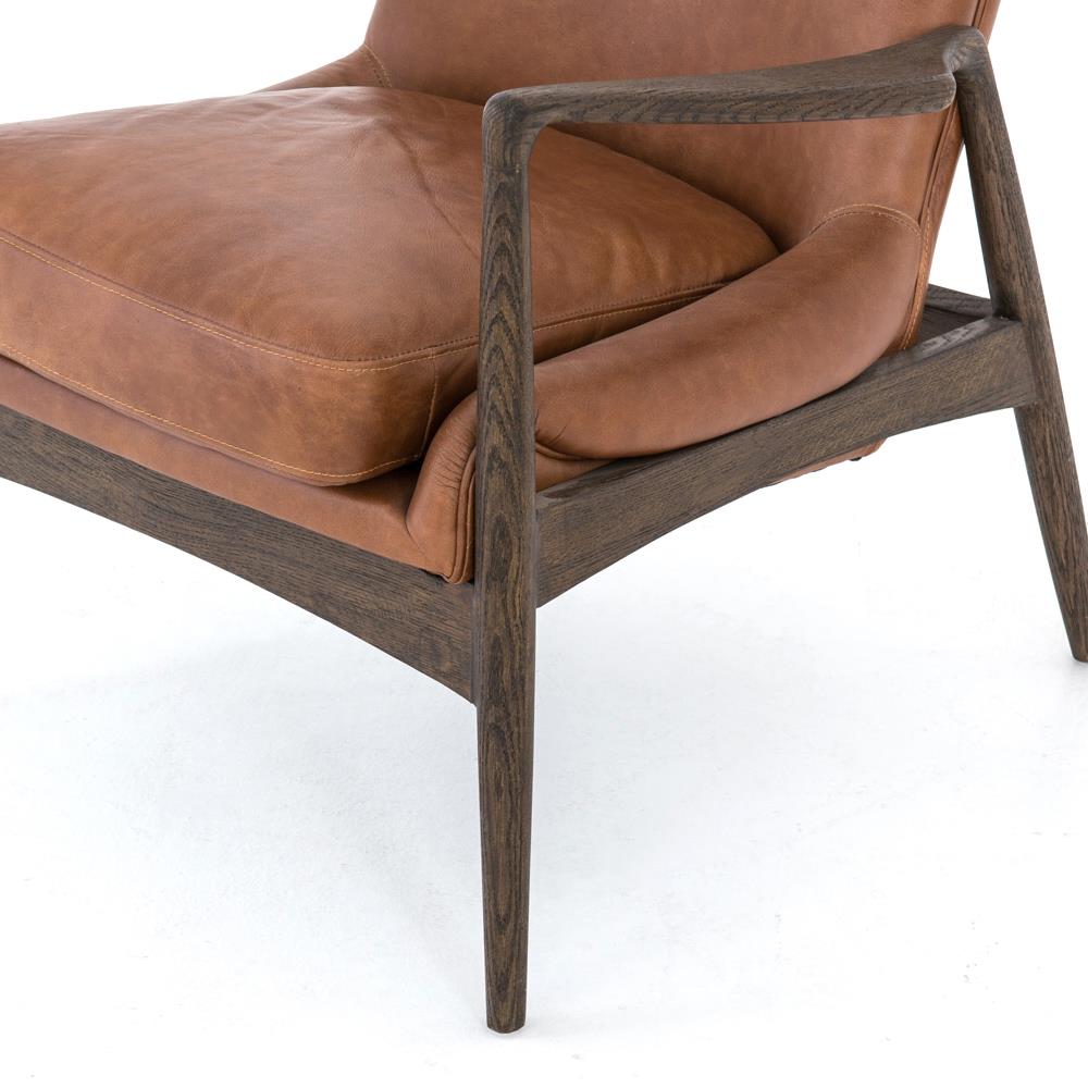 Influenced by mid-century modern style, our Olena Mid Century Brown Upholstered Leather Wood Frame Living Room Arm Chair features a scu ... more