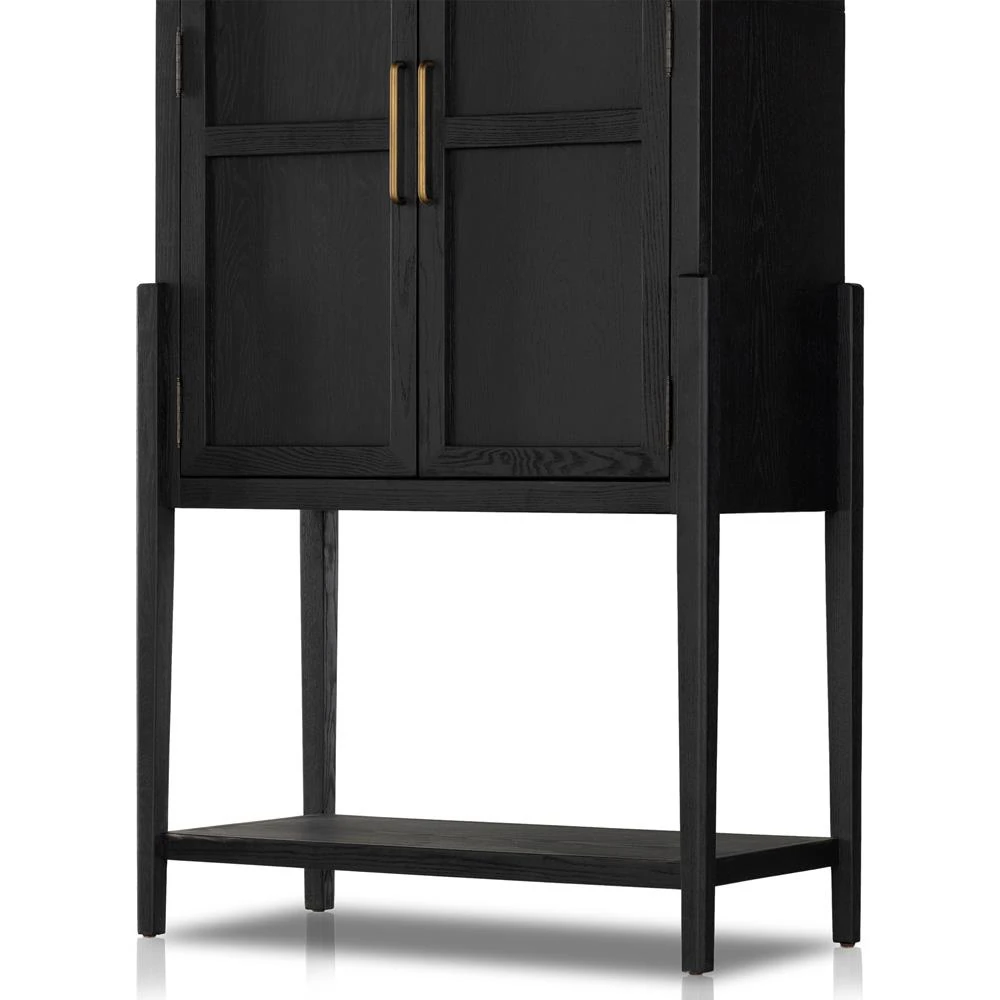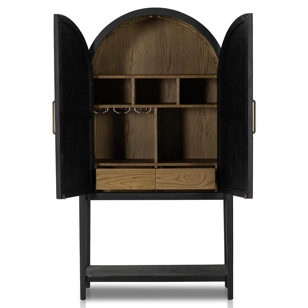 Ivan Mid Century Modern Black Oak Wood Brass Iron 2 Door Bar Cabinet