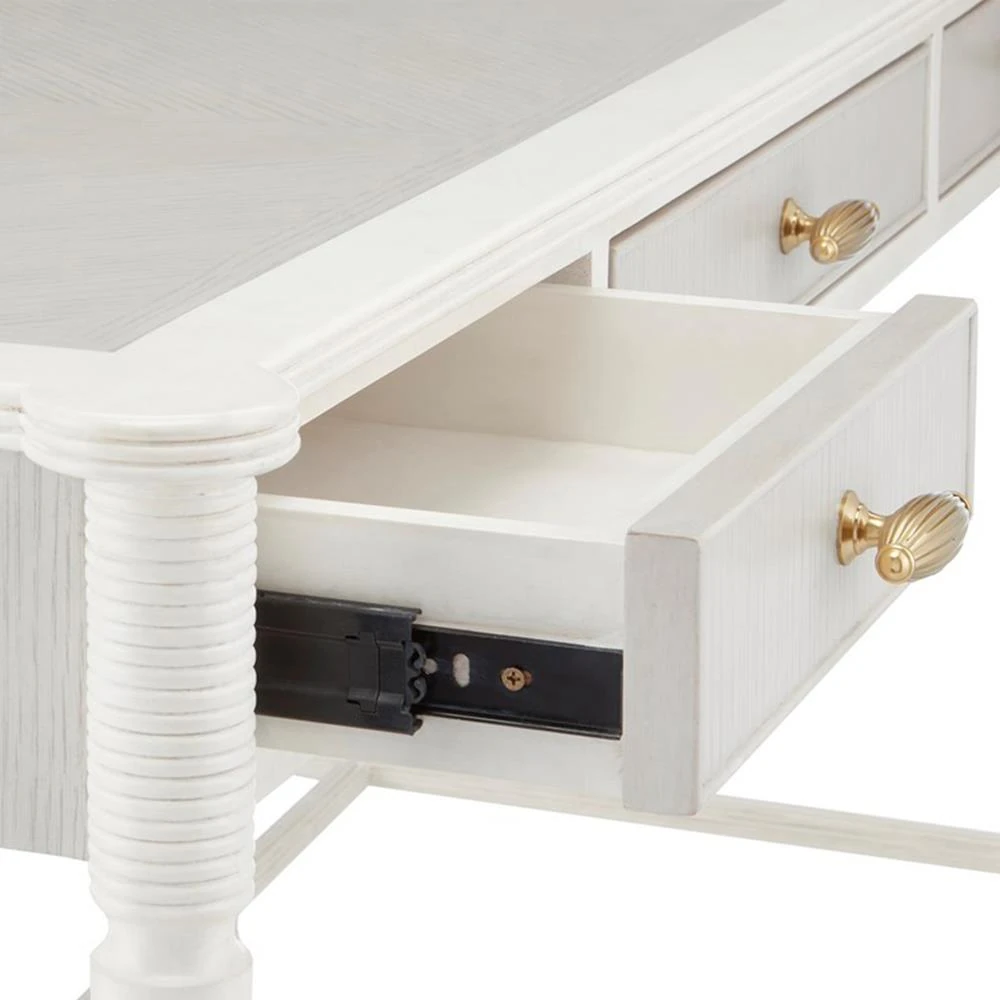 Ejiro Modern Classic Off White Mahogany Oak Wood Brass Pull 3 Drawer Desk
