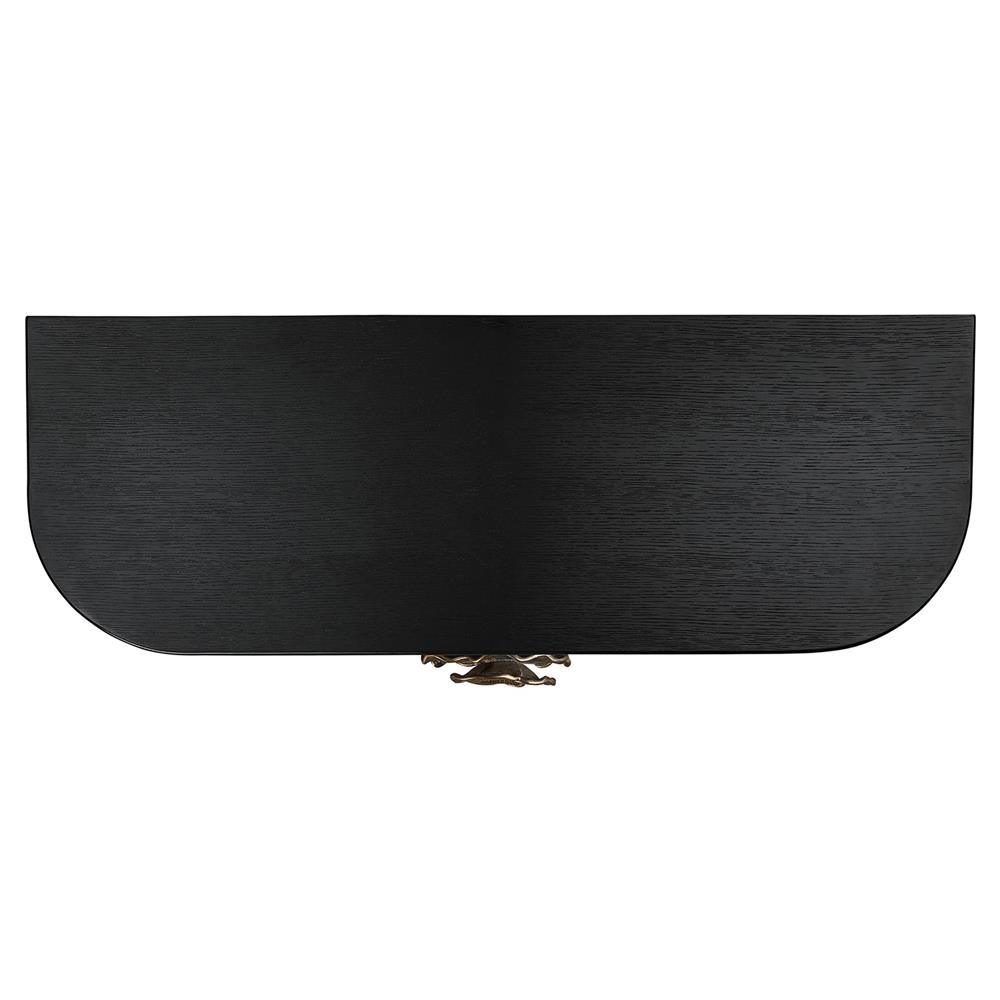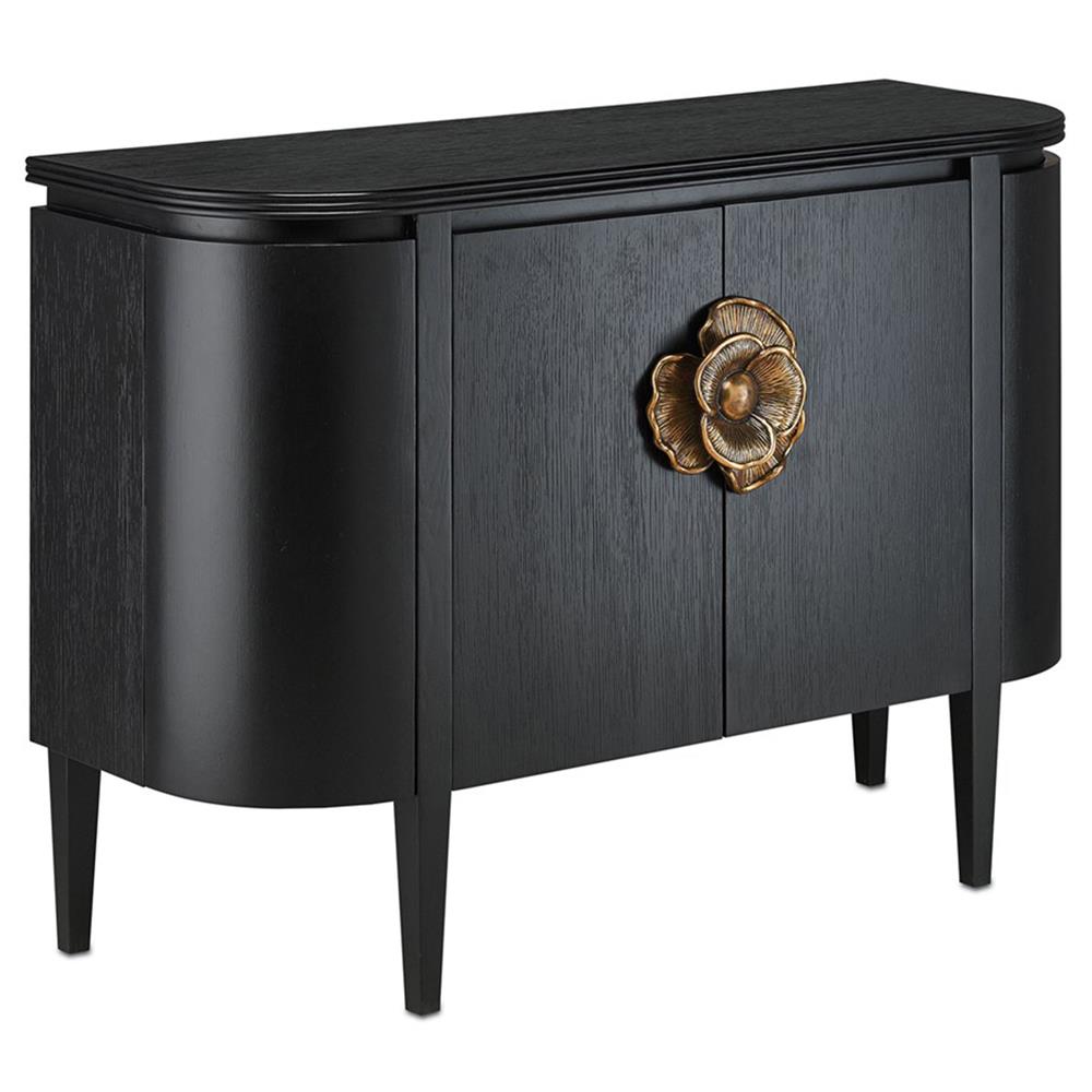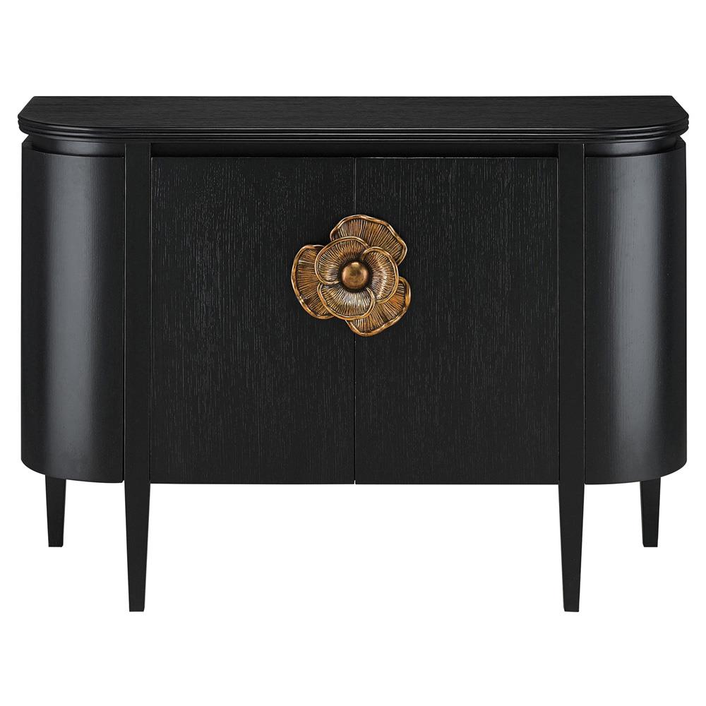 • Features a demi-lune shaped cabinet with sized brass flower pull contrasting the caviar black stain finish