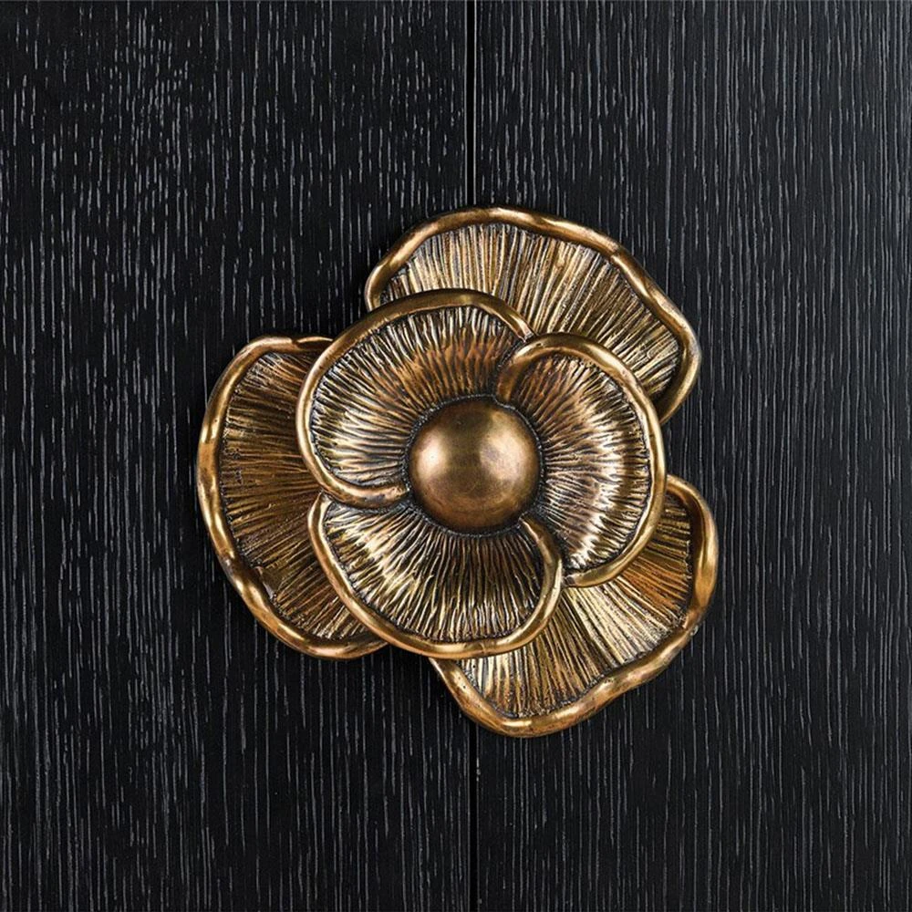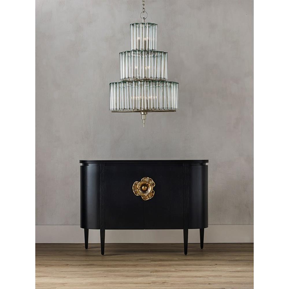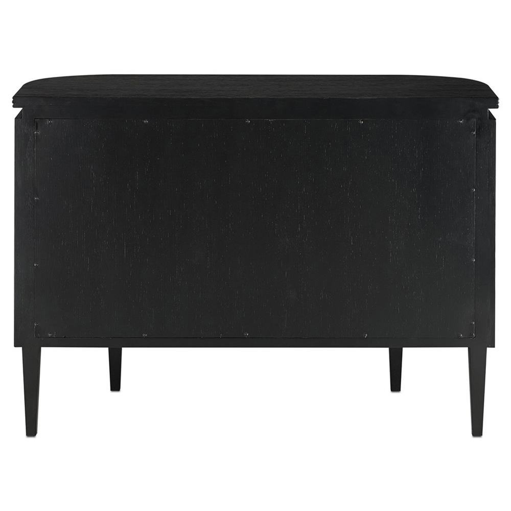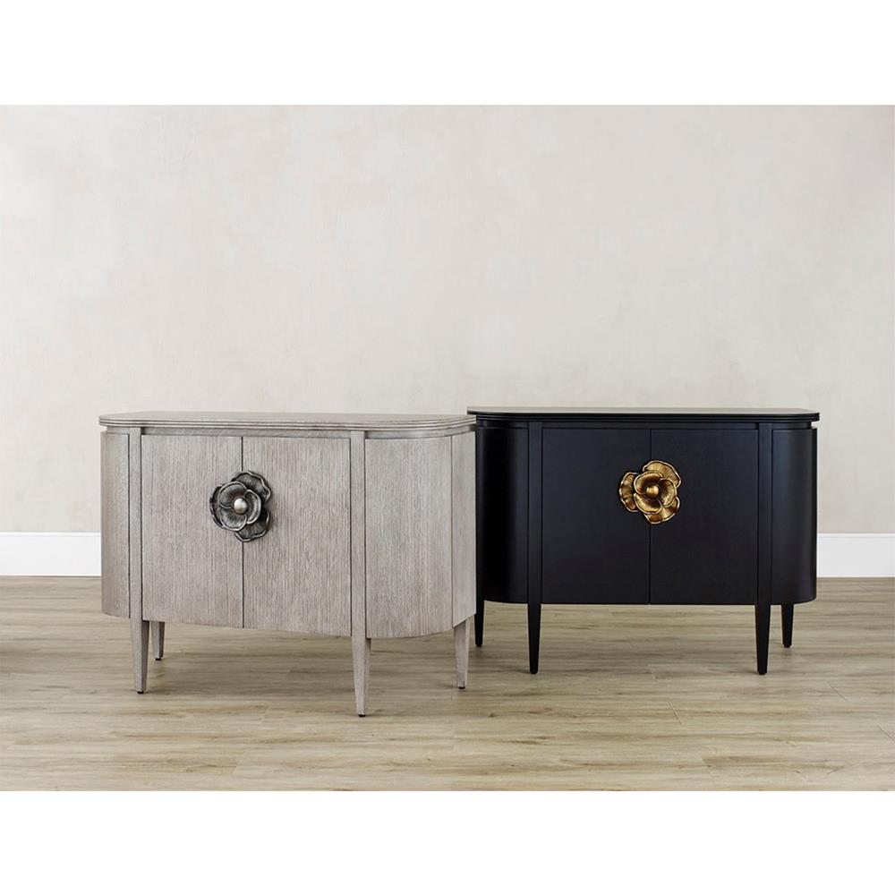 • Features a demi-lune shaped cabinet with sized brass flower pull contrasting the caviar black stain finish
