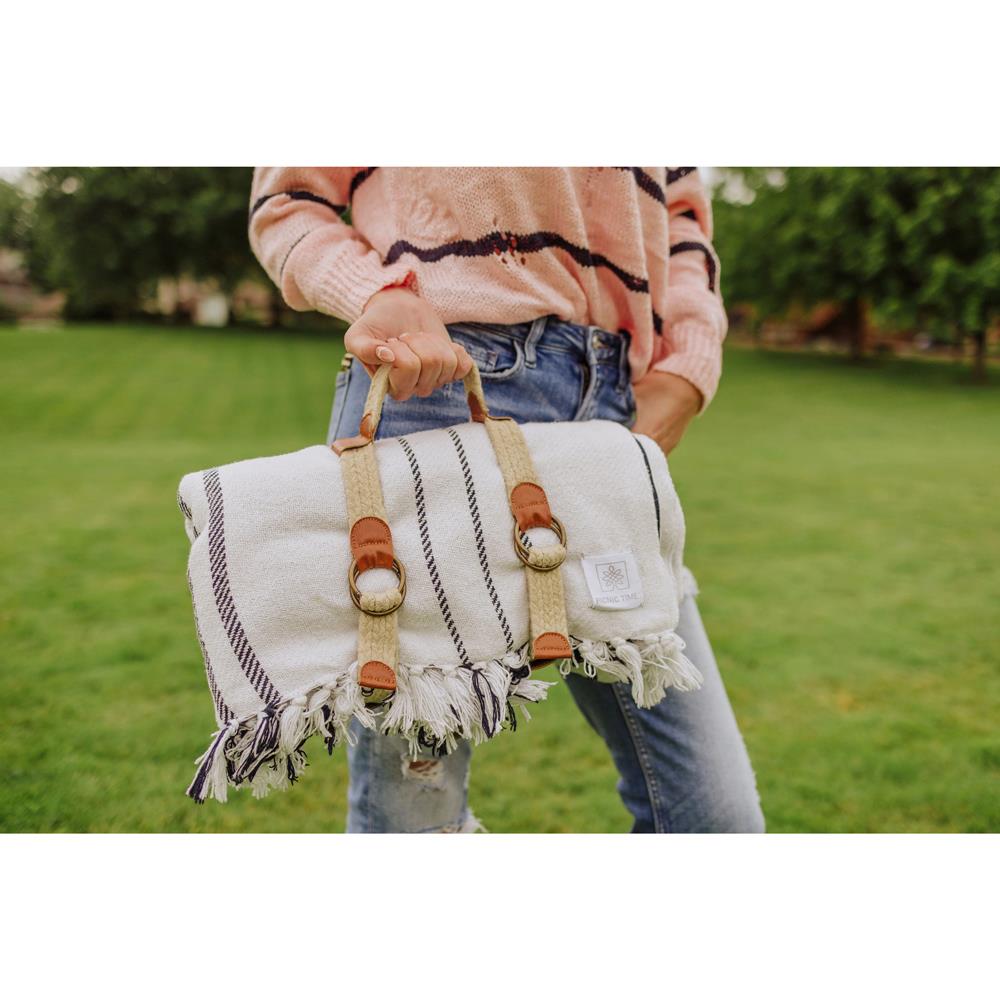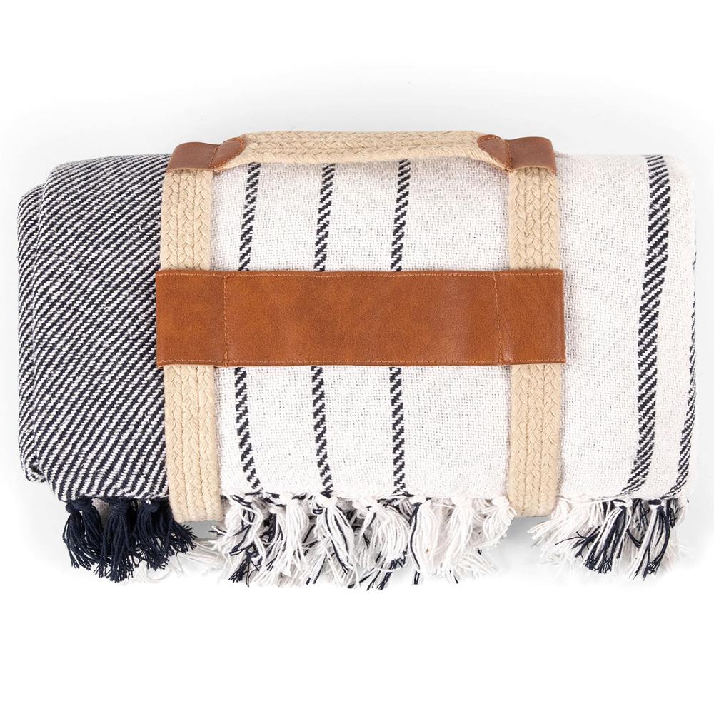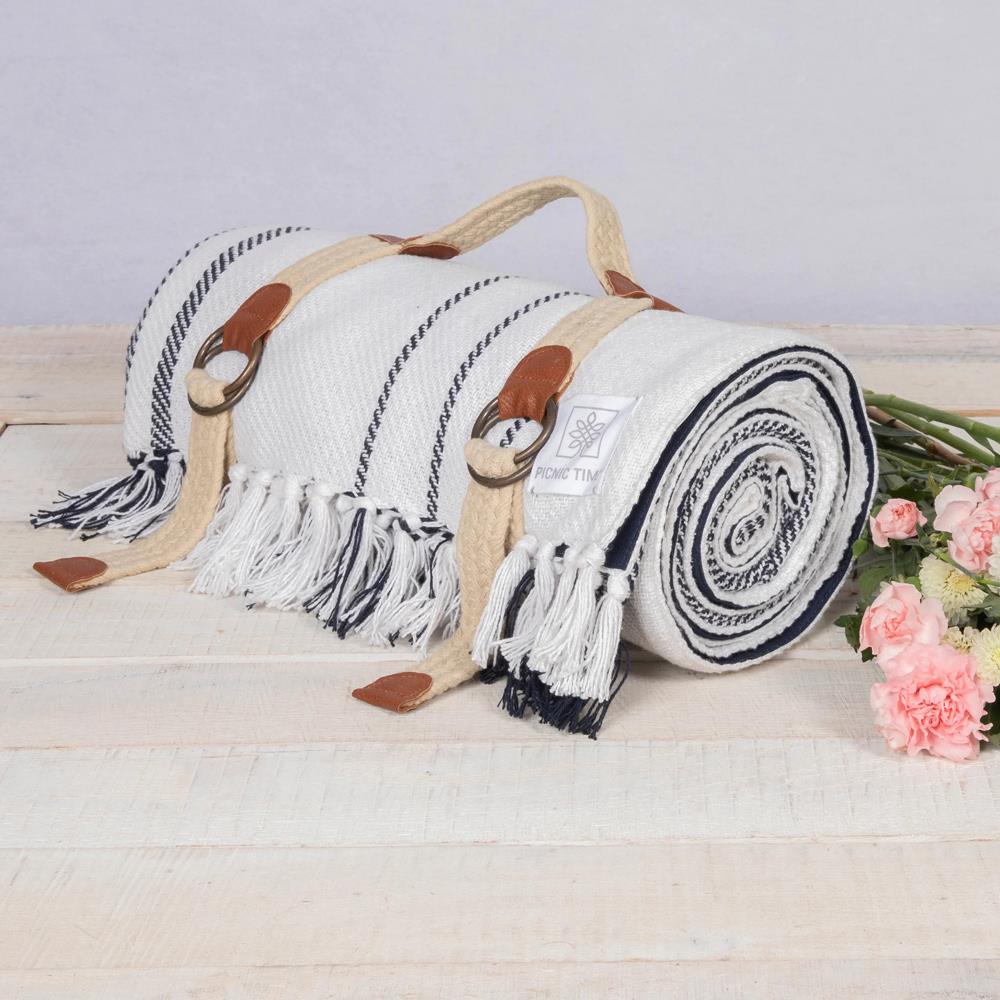 Milan Modern Classic White Woven Blue Stripe Cotton Picnic Blanket with Harness