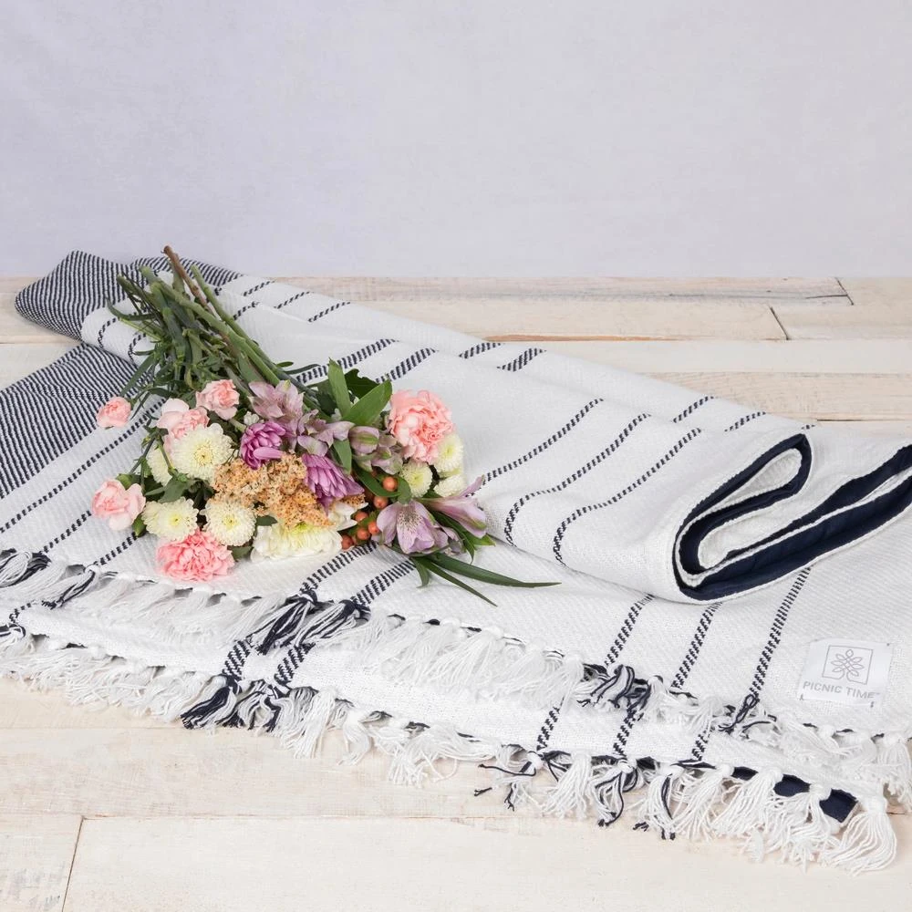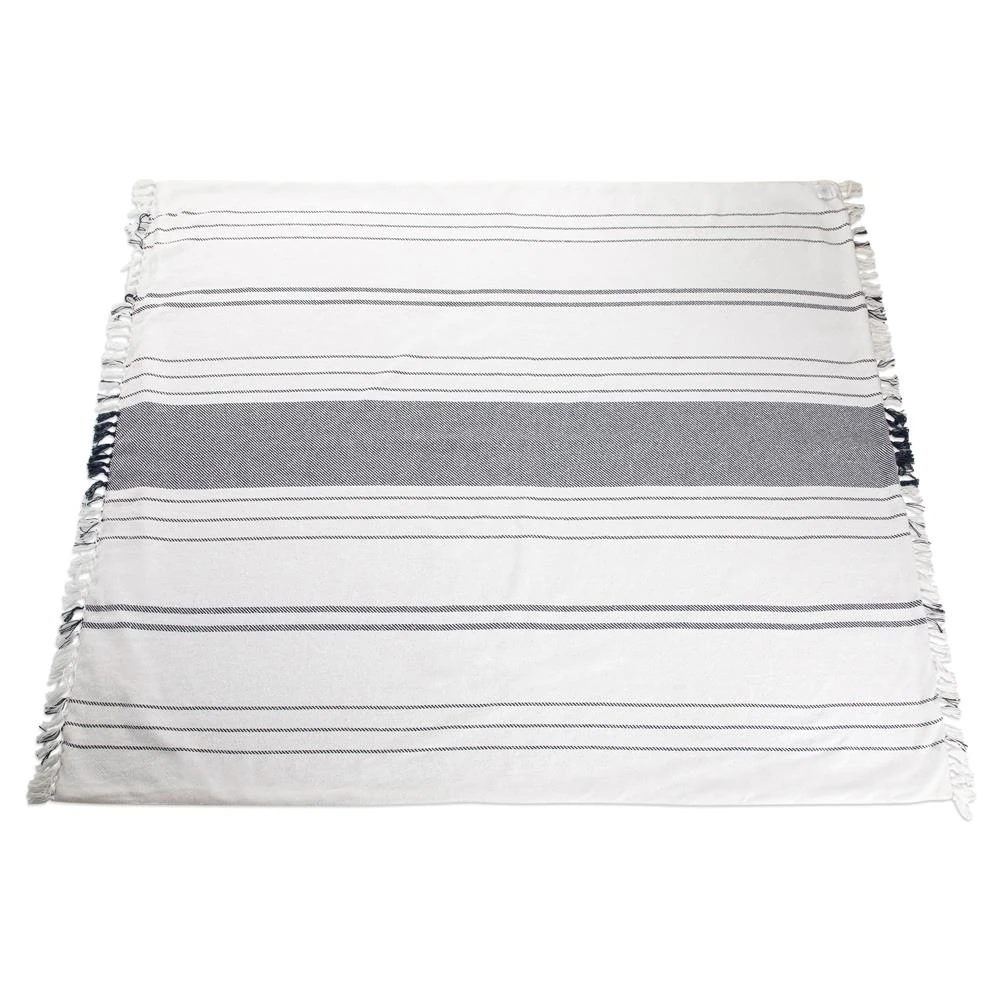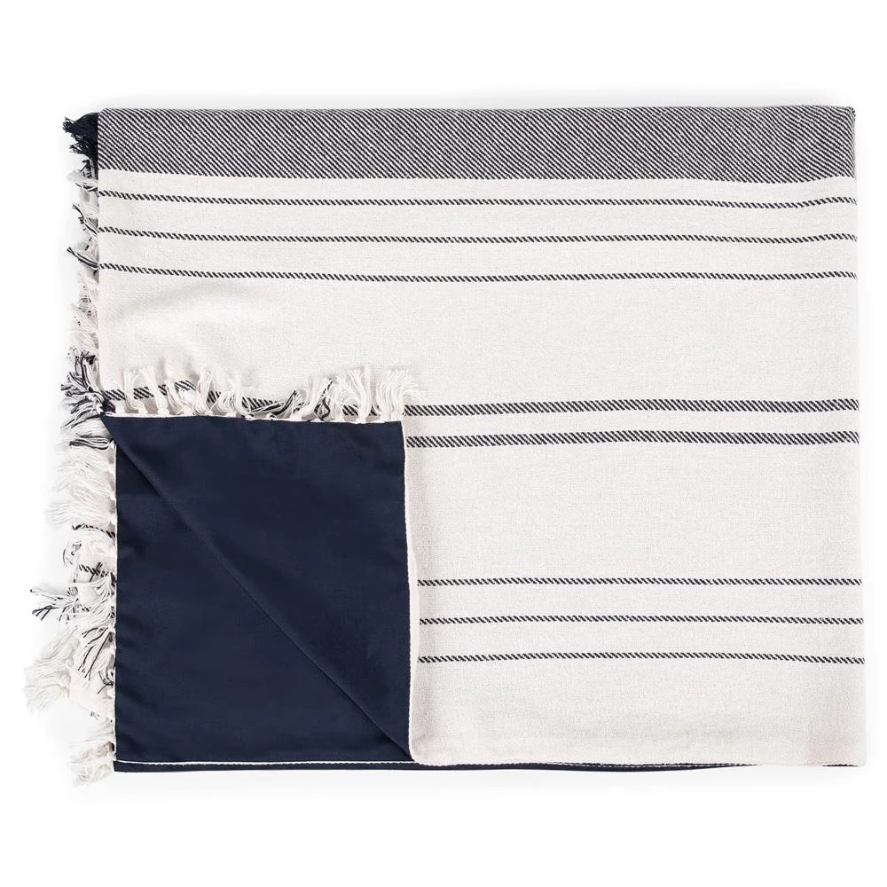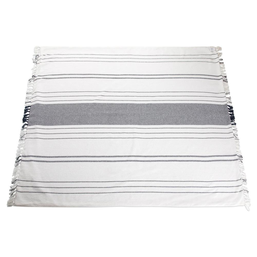 Milan Modern Classic White Woven Blue Stripe Cotton Picnic Blanket with Harness