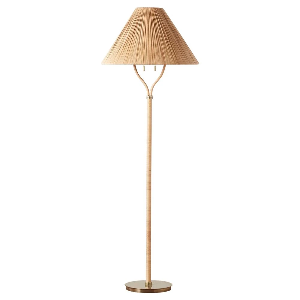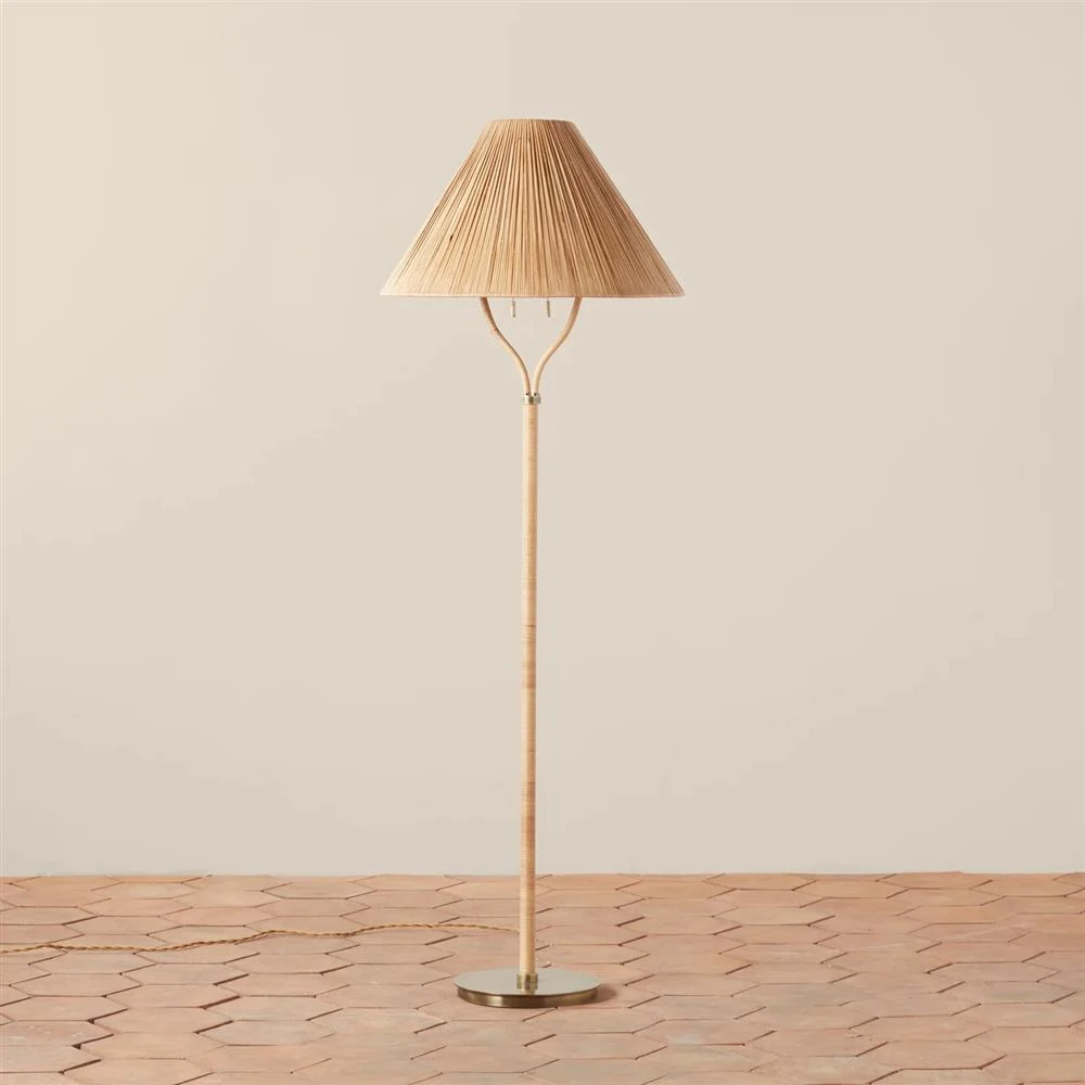 • Shevone Traditional Polished Brass Iron Natural Woven Floor Lamp|Kathy Kuo Home