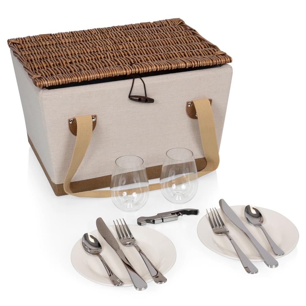 • Set includes: 1 basket, 2 plates, 2 forks, 2 spoons, 2 knives, 1 corkscrew, 2 stemless wine cups and 1 wine cap bag