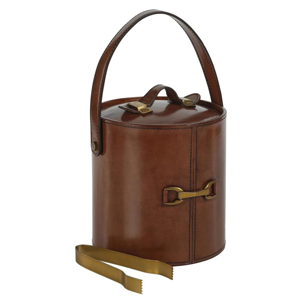 • Bristol Rustic Lodge Brown Leather Ice Bucket with Tong|Kathy Kuo Home