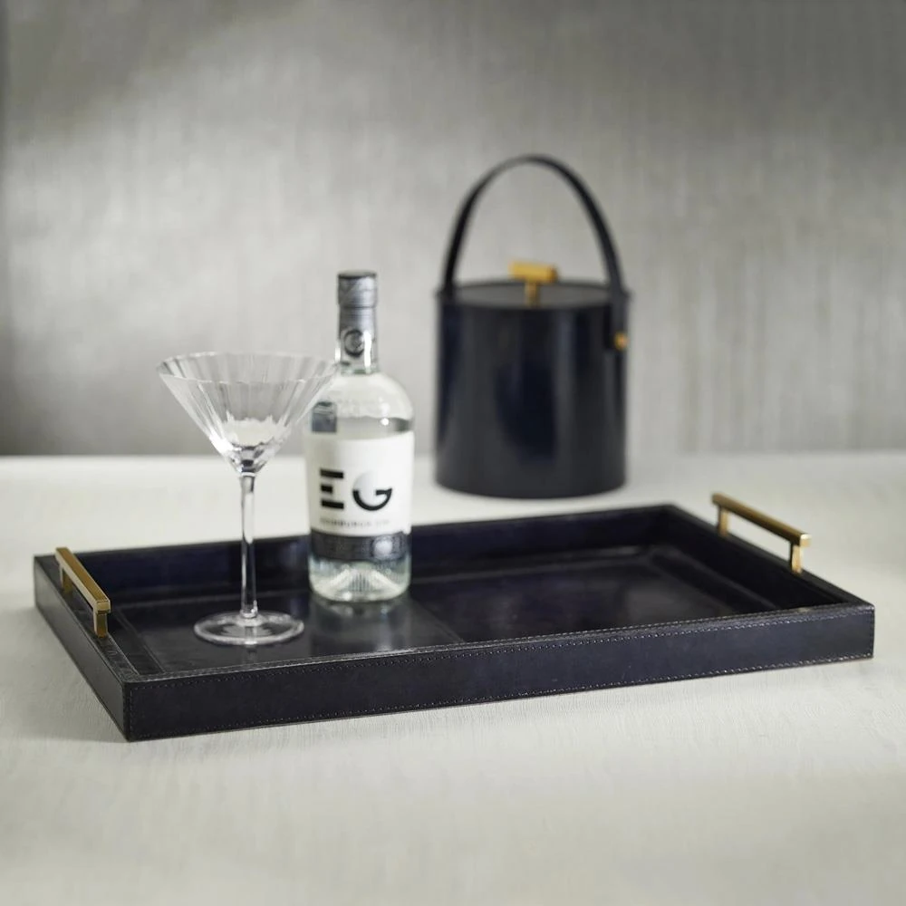 Fabiola Mid Century Blue Leather Gold Brass Handle Serving Tray