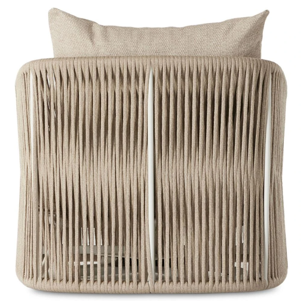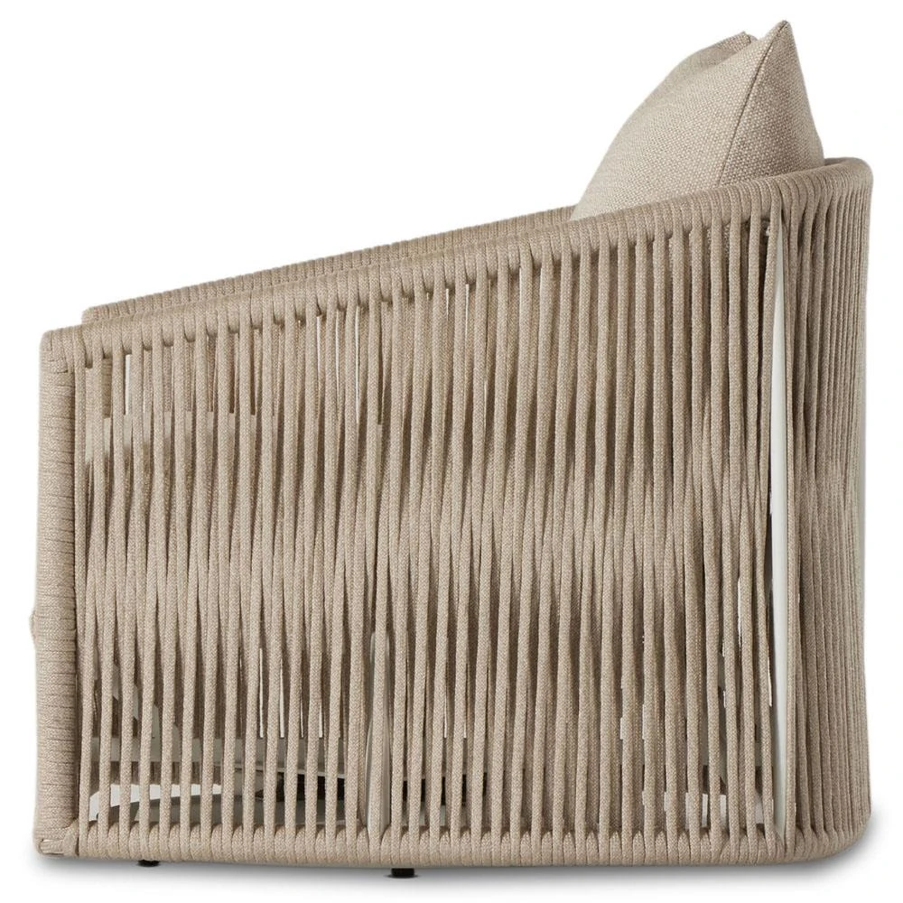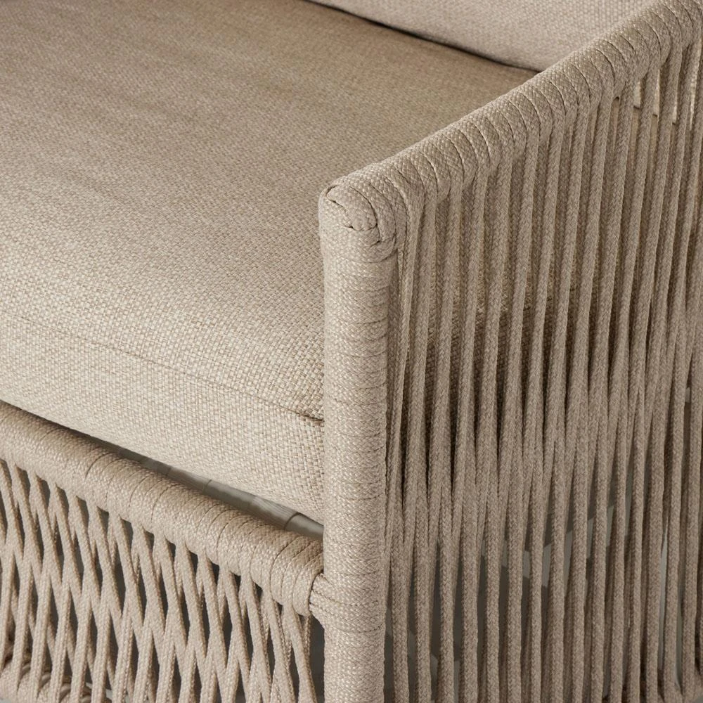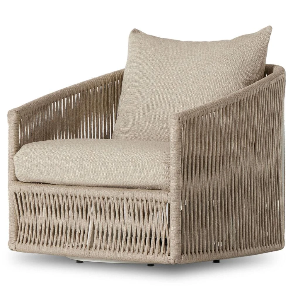 • Features a beautiful rope-based design woven across a durable, 360-swivel aluminum frame, with a box seat cushion and knife-edge back cushion, upholstered in UV-resistant, water-repellent, and quick-drying 100% olefin
