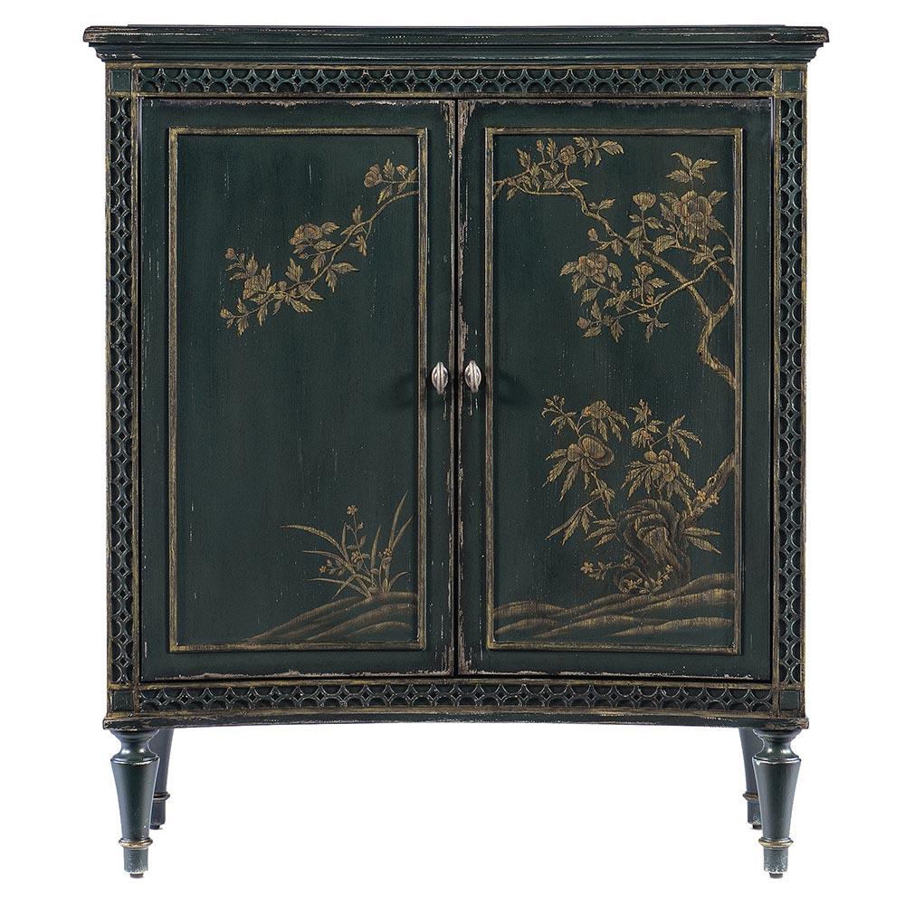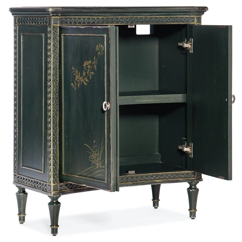 • Features 2 doors with soft-closing hinges and magnetic door catches, 1 adjustable shelf behind doors, concave shape, decorative fretwork accents along edges, handpainted door fronts and levelers