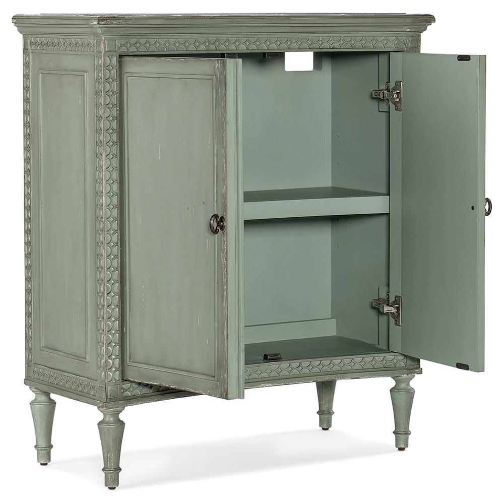 • Features 2 doors with soft-closing hinges and magnetic door catches, 1 adjustable shelf behind doors, concave shape, decorative fretwork accents along edges and levelers