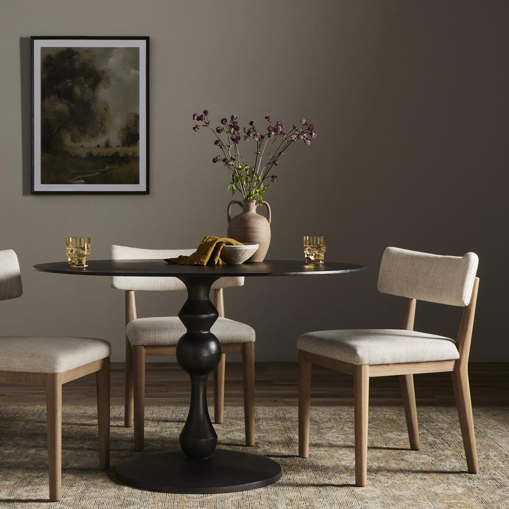 • Features bistro-style dining table with a turned, geometric look