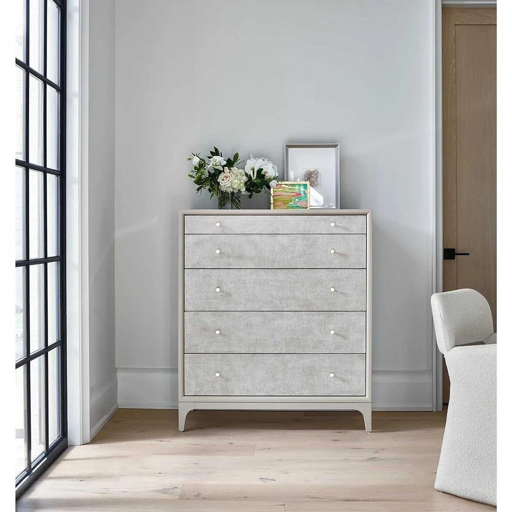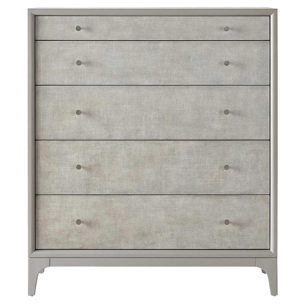 • Features 5 drawers with linen texture finish and metal pulls; Top drawer with center divider with 2 grey felt lined removable jewelry trays