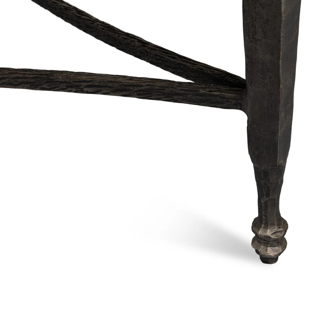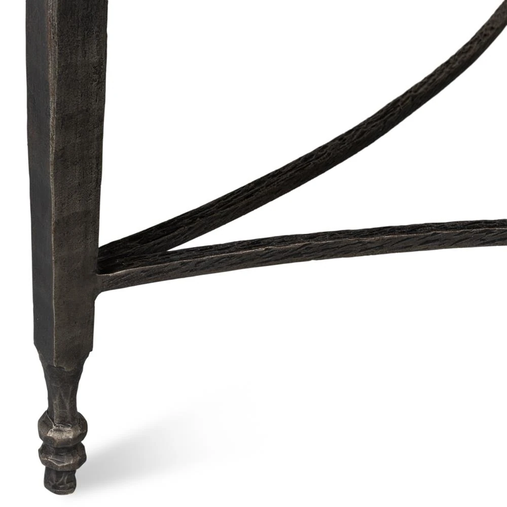 • Features hand wrought iron legs with intricate turnings and curvature